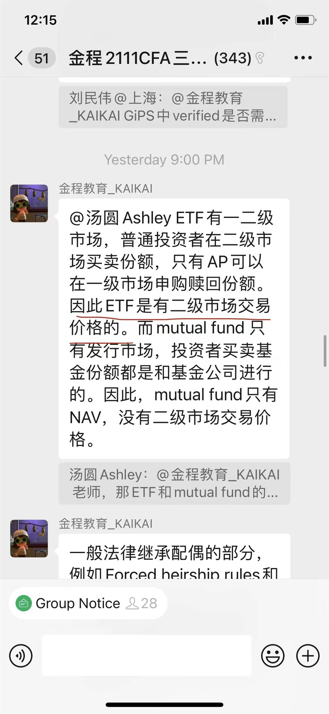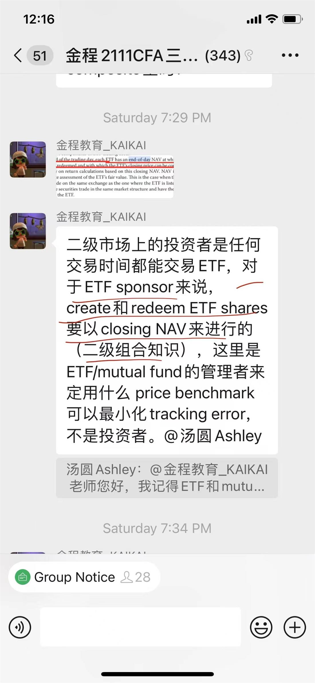老师您好, 如果我没有记错的话,ETF和mutual fund在任何时间都可以交易,但是mutual fund的成交价是收盘价,但是ETF的成交价可以是交易时点的任意价格。我想问一下这里reference price选closing price为什么可以minimize tracking error 相对于 ETF呢?ETF的成交价不一定是收盘价吧?然后我在学习群里面也问了这个问题但是还是有点没搞清楚, 开始老师说:”二级市场上的投资者是任何交易时间都能交易ETF,对于ETF sponsor来说,create和redeem ETF shares要以closing NAV来进行的“, 后来老师说:”ETF有一二级市场,普通投资者在二级市场买卖份额,只有AP可以在一级市场申购赎回份额。因此ETF是有二级市场交易价格的。”所以我想问一下ETF sponsor 用的是closing NAV, 而投资者又用的二级市场的交易价格, 这两个价格是不一样的吗?谢谢