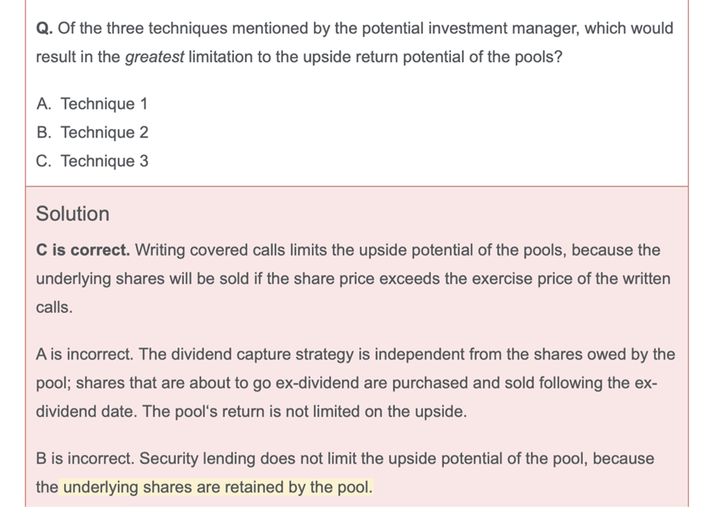 这道题我对upside potential和投票权都有疑问: 1.security lending 和covered call writing的upside potential, security lending是持有stock+借来stock再卖出(持有股票这点,也可参考答案“stock is retained by the fund”) cover call writing是持有stock+ short call 怎么比较两个的upside potential? 2.dividend capture持有股票,卖出前都有投票权 security lending,借来的股票(lender和borrower都无投票权,投票权在买的人),但是目前持有的自己的stock还有投票权 covered call持有股票,被迫行权前都有投票权 都有投票权,如何比较?【麻烦老师看下我说的再回复啦,谢谢!】