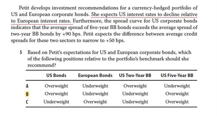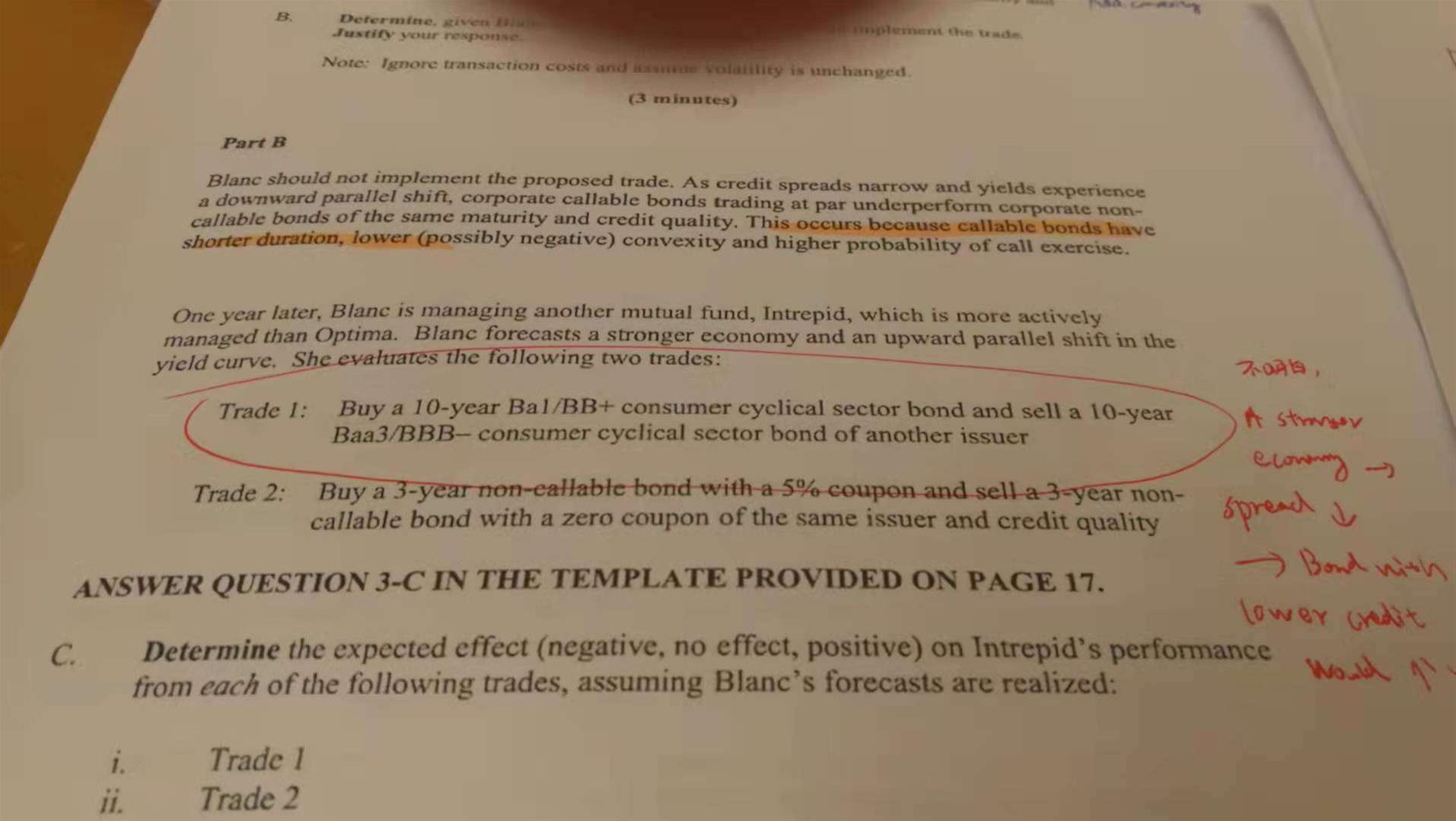 预测经济会变好,credit spread变小的情况下, 1. 原版书课后题21章5题(见截图1)给出的结论是: 两个bonds Maturity一样,但信誉更低的那个价格会上升(因为default risk预计下降),因此应该提前买入信誉更低的证券(因为未来价格相对于信誉更高的证劵来说会上升),卖出信誉更高的证券(因为经济变好的情况下,信誉更高的证券预计价格相对于信誉更低的证券来说会下降) 我的问题是 1:ips 2015 q3 part b (见截图2)中给出的答案是不是就说的是上面那个意思?答案表述有点绕,我没完全看懂。 2: 2013 q9 part b(见截图3)想表达的意思是不是: 这道题同样是credit spread 缩小,两个信誉等级相同的证券,本来maturity长的那一个(30 year)相对于maturity短的那一个(3 year)价格是上升的。但是从另一方面考虑,因为interest rate上升了,所以Maturity长的那一个(30 year)相对于maturity短的那一个(3 year)价格下降更大,所以这种情况下,两种不同方向的effect叠加,综合考虑还是应该是卖掉30年证券,买入3年证券?