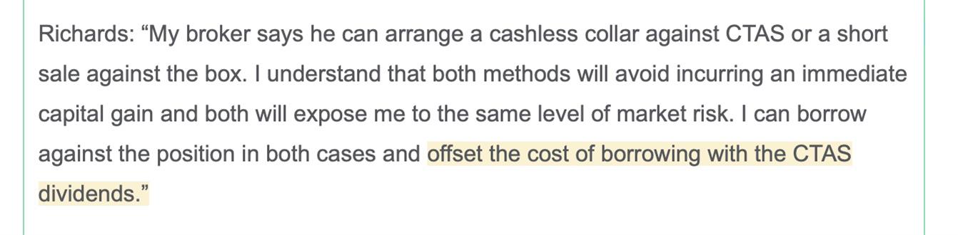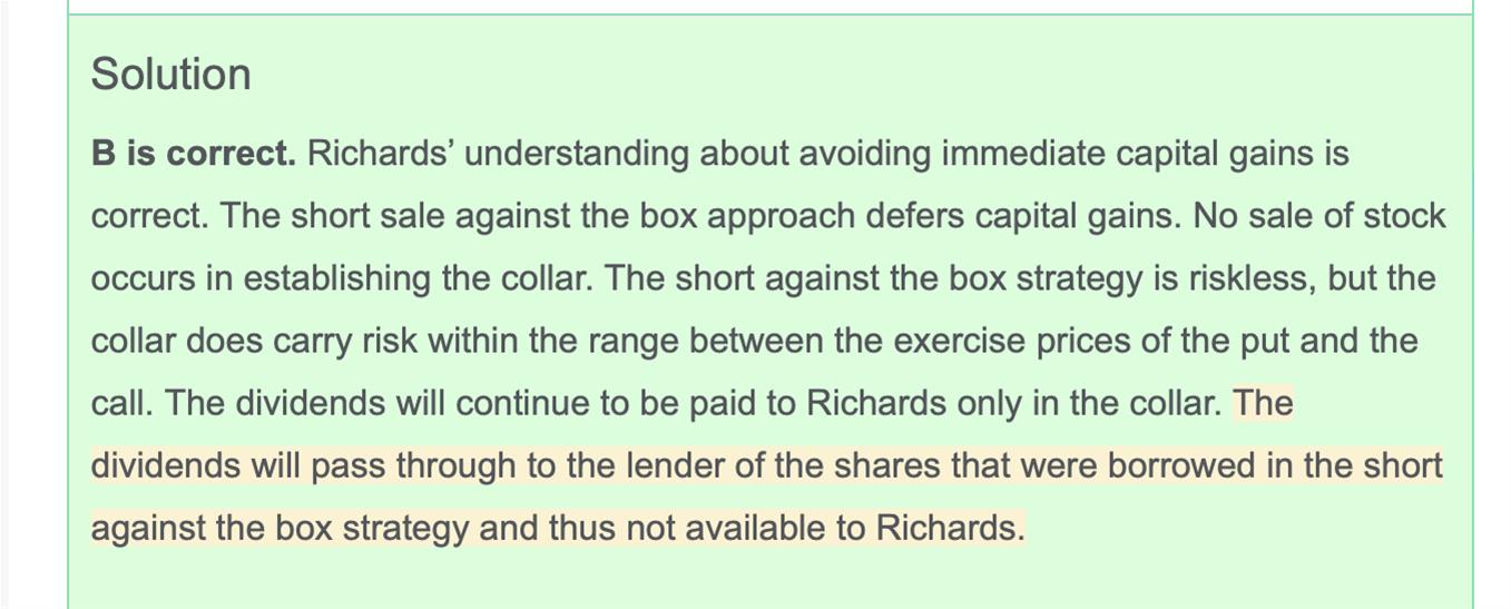 感觉这里说的不太严谨,在short sale里用 dividend去offset the borrowing cost,如果是用借来的股票的dividend,那肯定是错的。但是如果是用他自己原来持有的股票的dividend去支付,这个就没问题吧(反正题目也没说清楚到底是哪个dividend)。当然我们明白考点是问short selling的dividend是否还属于lender,只是这里的确有漏洞吧,和老师讨论下。