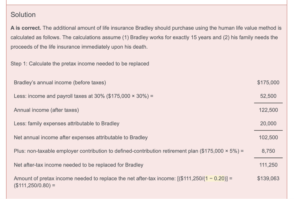 这道题,前后我都懂,就是求pretax income needed to replace after tax income这里,为什么除以(1-0.2)?我看了一下Exhibit2,有两个税率,应该用30%的那个吧。20%的税率针对的是income on insurance,跟这个收入相关的税完全无关呀