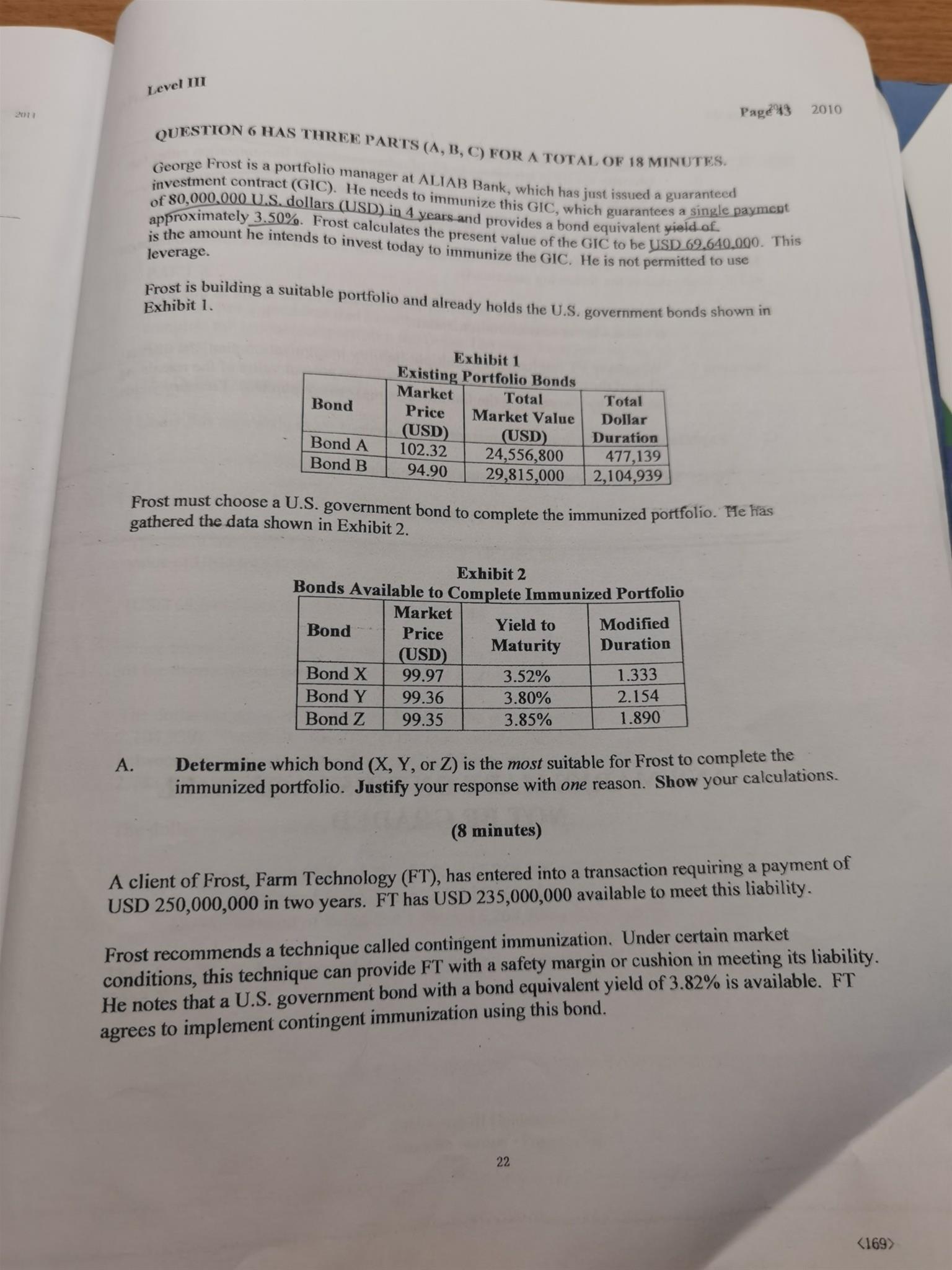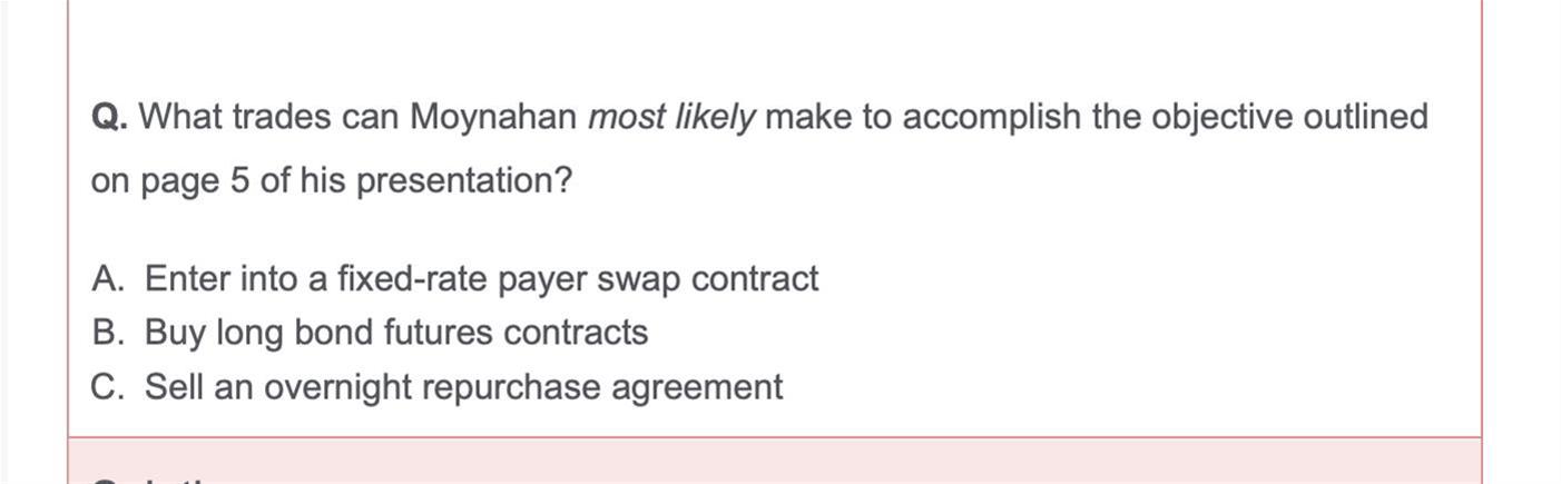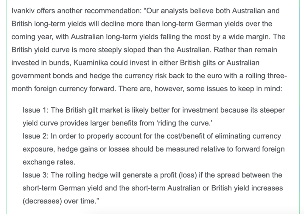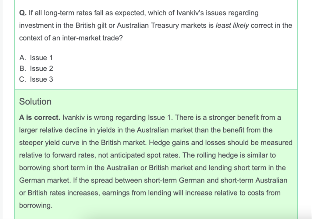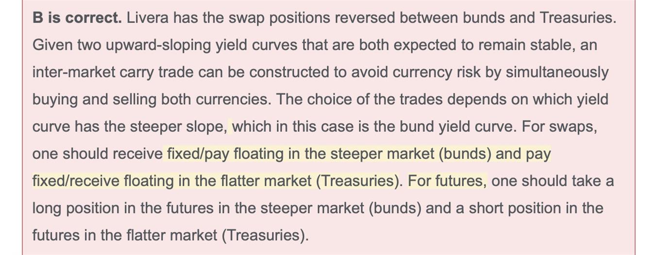这题虽然对了但我对答案的思路还是有疑问。我自己的想法是:1.British gilt 不一定更好,虽然更steeper且收益率更高,但是要考虑GBP未来贬值风险,虽然用forward去hedge,也要考虑forward的交易成本、对手方风险。最主要的是,原文说curve不是stable的,因此不能用ride curve这个策略。2.对于答案说的“rolling hedge is similar to borrow short in AUD,lend short in EUR”有疑问,应该是在EUR借钱,去AUD或者GBP投资吧?3.我对于issuer3的理解是,根据IRP,如果AUD与EUR的spread上升,(按照题目的假设是AUD 利率高于EUR,否则也不会要投资AUD),那么AUD利率更高,未来会贬值,这时候应该hedge,比不hedge会带来更多profit,所以他是对的。但是答案完全不是这个思路。