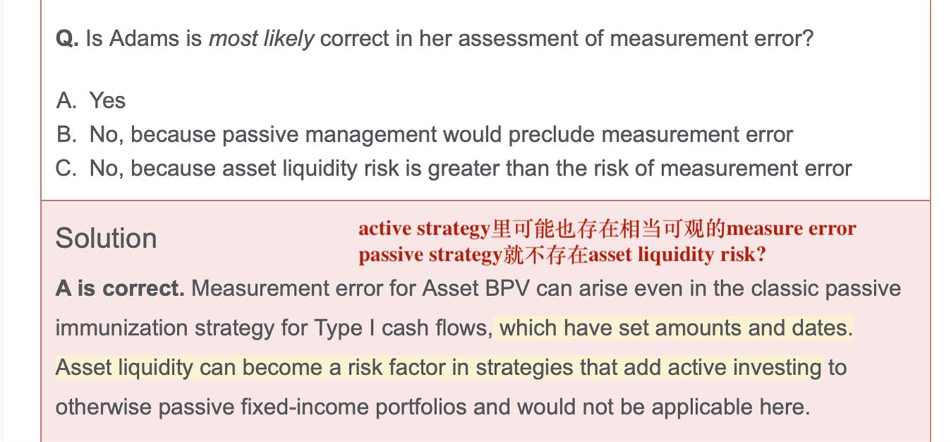 已解决如何比较passive&active的liquidity risk,measure error risk?答案说的不太对吧,measurement error和liquidity risk都同时存在于active/passive,没法宽泛的去比较大小。如果passive investment里benchmark有些组成流动性非常差,active里就去除掉了这一部分,那比较而言肯定是active的liquidity risk更小。