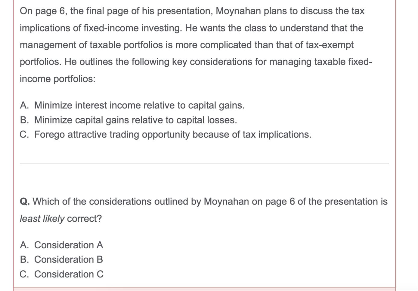 已回答为什么foregone 好的投资机会是对的??我觉得这道题B和C都不对啊…而且两个错误都很严重,你不能为了要避税就放弃capital gain,也不能因为避税放弃好的投资机会啊…官网题太难太偏了吧