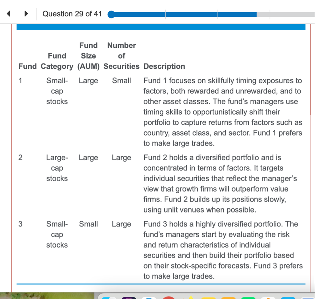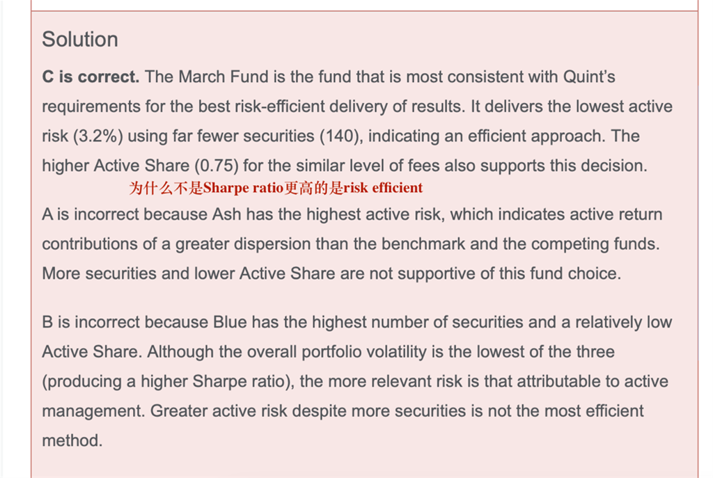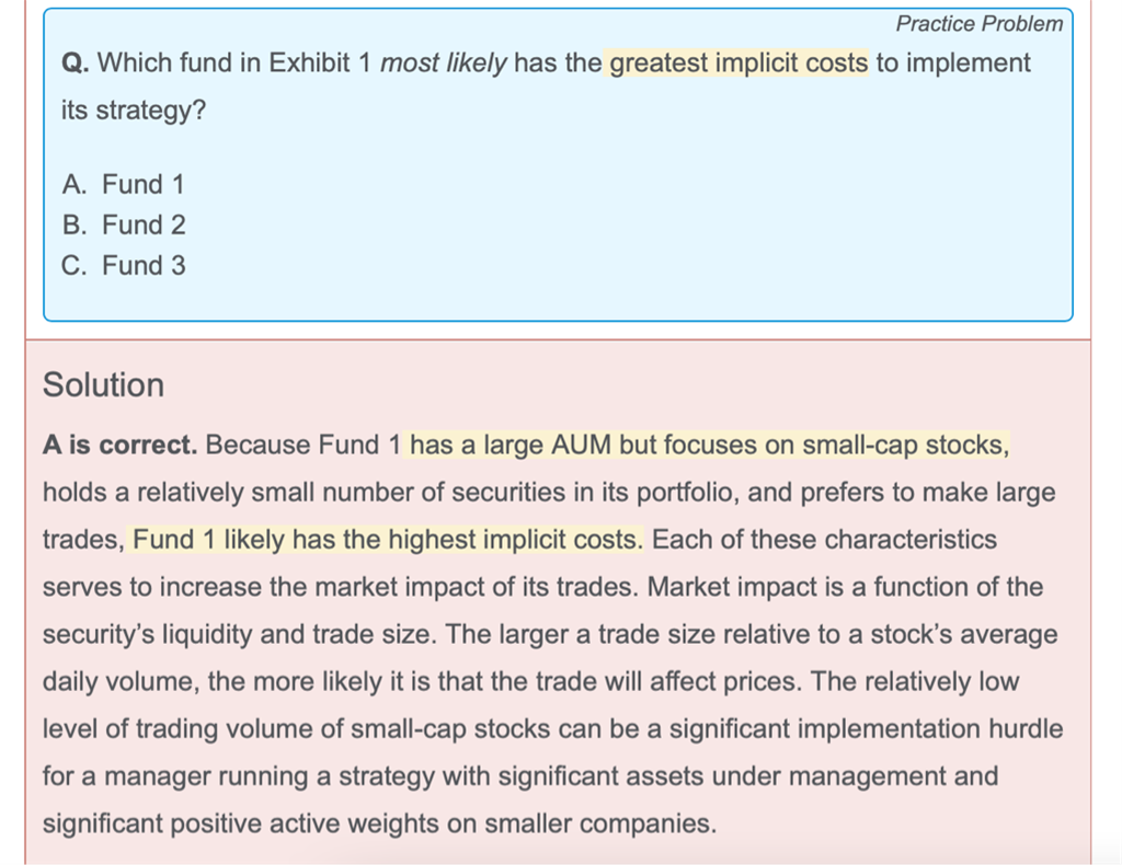 为什么不选Fund2?原文里明白说了,build position slowly,建仓过程太慢,会导致成本上升,这个不算隐性成本吗?而且还用暗池交易,成本不是更高了嘛!固然答案说的,large AUM去买small cap成本也会高,如何比较这两个不同类别成本的大小呢?不能凭感觉吧!!!