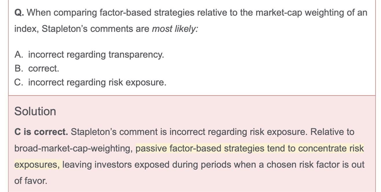 官网 equity Q14 为什么相比于market cap weighting,factor based strategy更集中?factor不是更加分散吗?另外我百题做的还可以,但是官网题做的很差😥是官网题比较难吗?我做了一点官网equity,吐血三升已经。