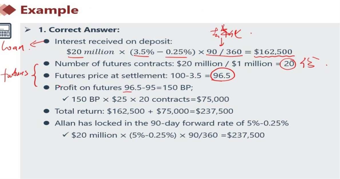 你好,这个题也有一点儿乱。首先,求120天后future价格为什么用100-3.5% LIBOR?这个3.5%不是forward rate啊?其次,用96.5-95得出来的是future价格的变动,怎么能用这个150bps去*25呢,one basis point change in forward rate will cause contract value to change $25, 那么用150bps乘,相当于future contract自己的变动率造成自己合同价值变化?这个不make sense啊。