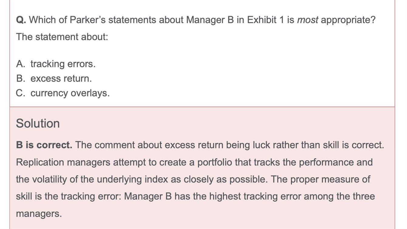 官网题equity Q9 如果是full replication manager,那把tracking error当作skill衡量标准是合理的,但manager B是stratified sampling,和完全复制就是不一样,就是必然有更高的tracking error。照这么说,full replication的skill肯定高于stratified sampling?这明显不合理!
