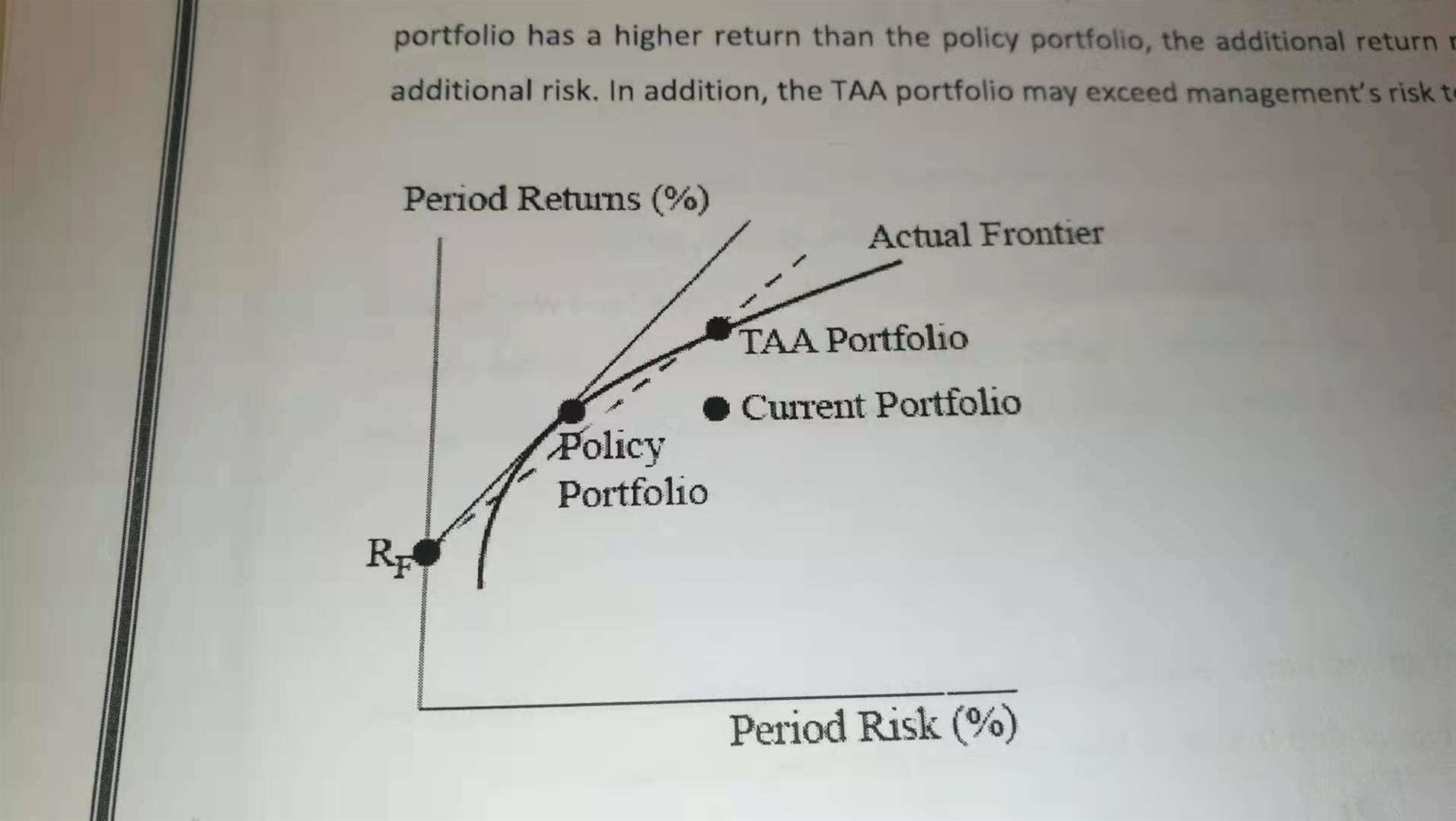 已回答Asset allocation百题case 6 的第4题:老师,答案画的图是不是有问题?policy portfolio是跟actual frontier相切的(实线部分),这个是没问题的。taa portfolio跟actual frontier是相交而不是相切的(虚线部分),这个不对啊。