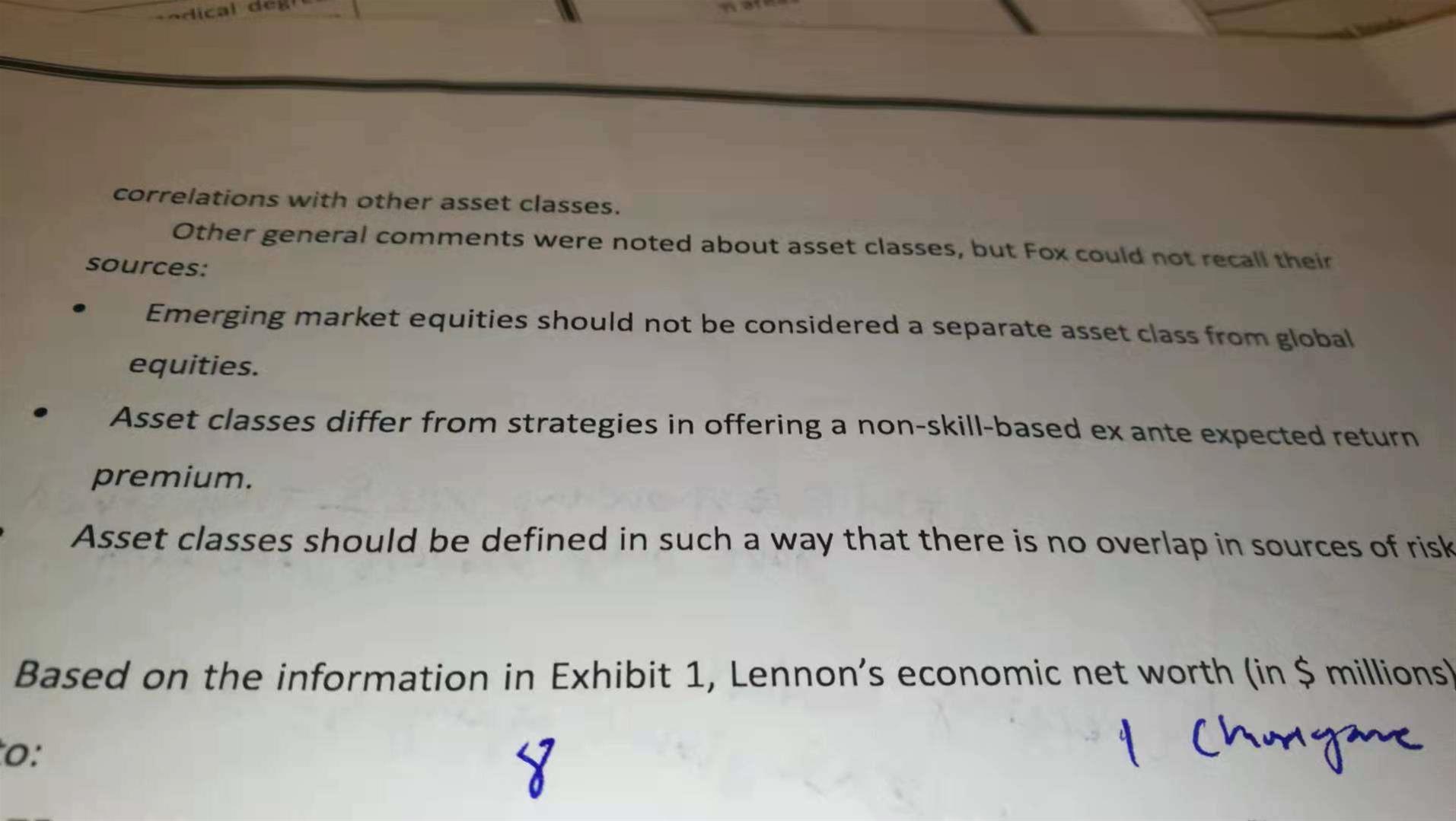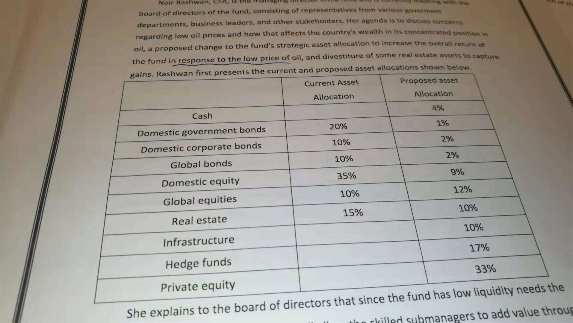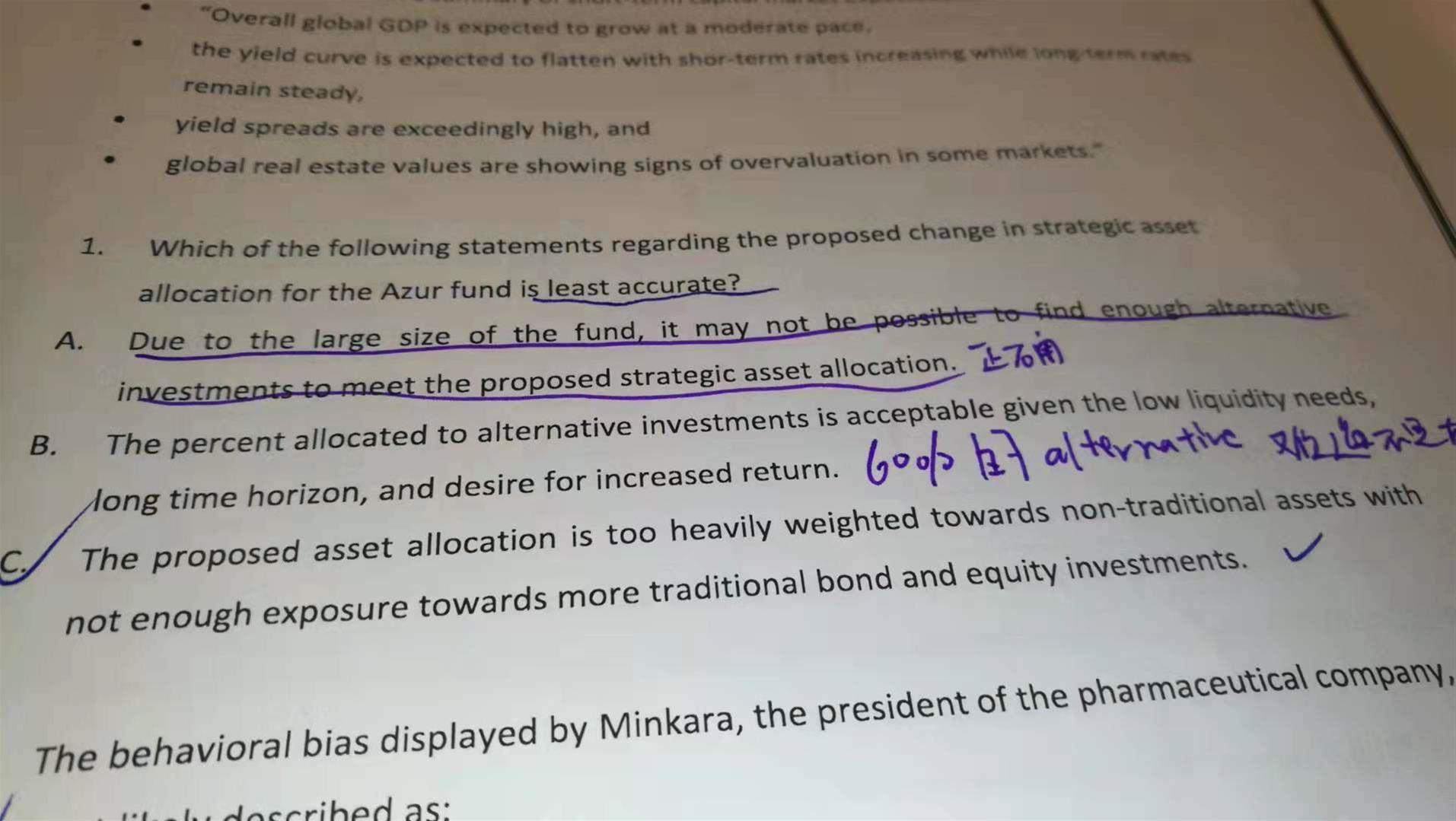 Asset allocation百题case 2 的第1题:老师,这道题alternative assets 占总assets的将近60%了,答案却不认为这个比例is too heavily weighted towards non-traditional assets. 那alternative比例究竟多少算是heavily weighted? 这道题如果给的alternative assets所占比例换一个数字,比如40%,70%,80%,这道题我还是不会做。