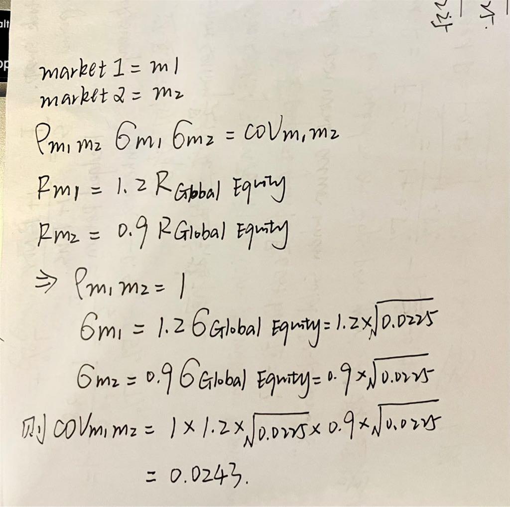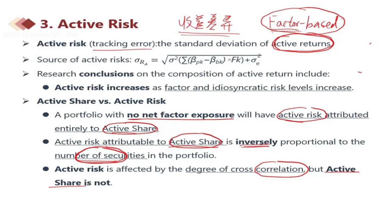 你好,接着上一个active share的问题问一下reading 25课后第6题。课上的时候我们讲的是,个股之间相关性越高,risk越高。如果按照这个逻辑的话,这道题从两个相关性高的股票换成完全不相干的,active risk应该降低?其次,这道题是没有factor影响的,那么根据讲义结论,active risk完全取决于active share, 如果第7题的结论是正确的,active share 不变,那么active risk在这儿也应该不变?最后,我自己理解,跟我刚刚问的第7题联系在一起,之前的benchmark里面不包含这个能源和金融个股,现在新配了这两个个股,导致active share increase,而此题又没有factor影响,那么active share会完全影响active risk,所以active risk increase. 我觉得只能这么理解,不然根本没法理解,因为课后答案跟课上讲义是冲突的。