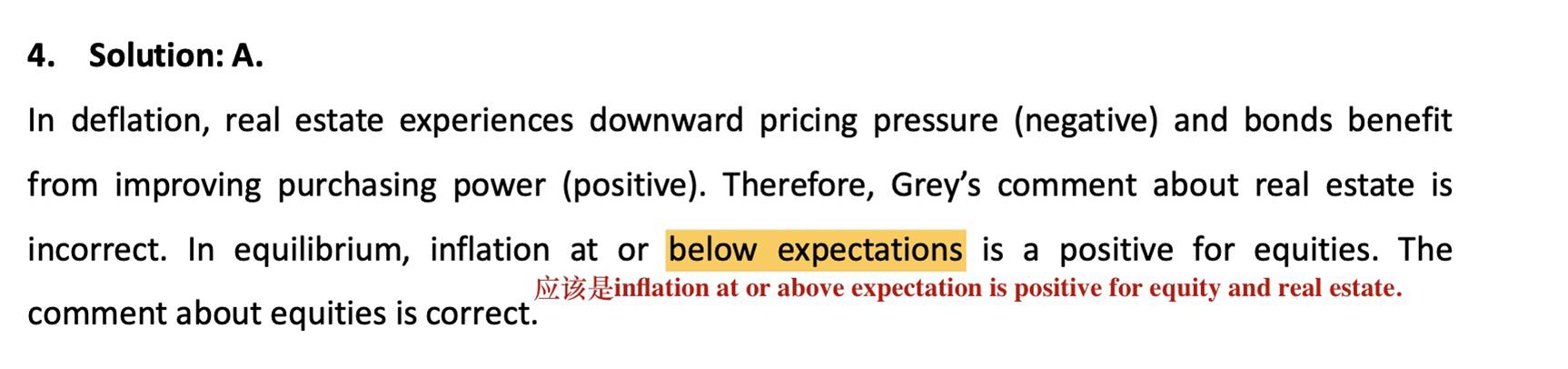 已回答百题case4 Q4 应该是inflation下降有利于bond,但是inflation at/above expectation有利于equity和real estate吧,这两个能抗通胀。原题在real estate方面说的不对,但是答案在equity这边说的也不对吧。