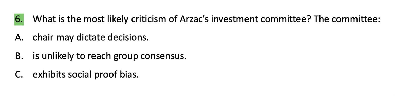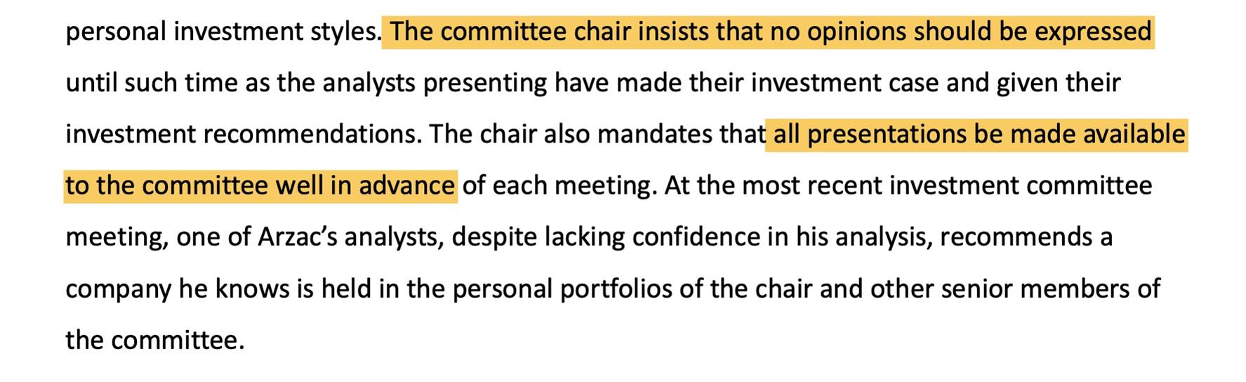 case5 Q6 为什么还会有social proof?感觉上committee已经把所有可能导致social proof的漏洞都堵住了。1)committee成员背景分散化,2)在分析师自己提出观点前,no opinion should be expressed,防止从众和附和,3)presentation要在每次会议的最开始,这样不会被其他信息干扰。至于最后分析师推荐了委员会主席和成员都持有的股票,这也是没办法的事情,至少在程序上这些做法是没问题的。