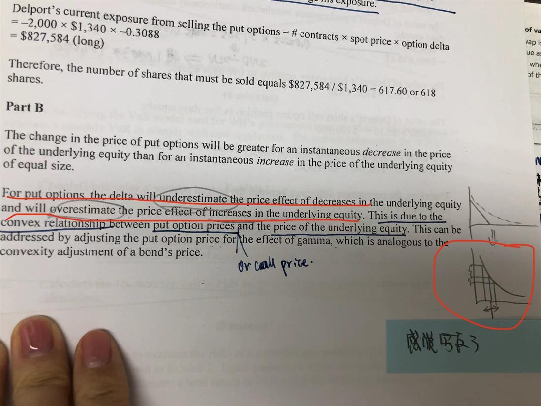 老师您好,这里我感觉我理解是反的。 对于put option来说, decreases in the underlying equity 所带来的put value的增长是更大的, 而increases in the underlying equity 所带来的put value的减少是更小的, 所以这才是涨多跌少, 可是为什么这里说的是for put option, the delta will underestimate the price effect of decreases in the underlying equity and will overestimate the price effect of increases in the underlying equity呢?谢谢
