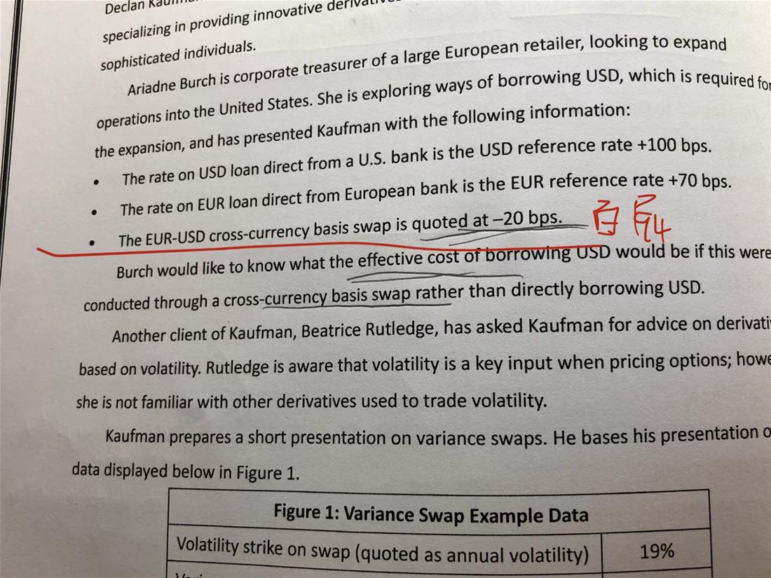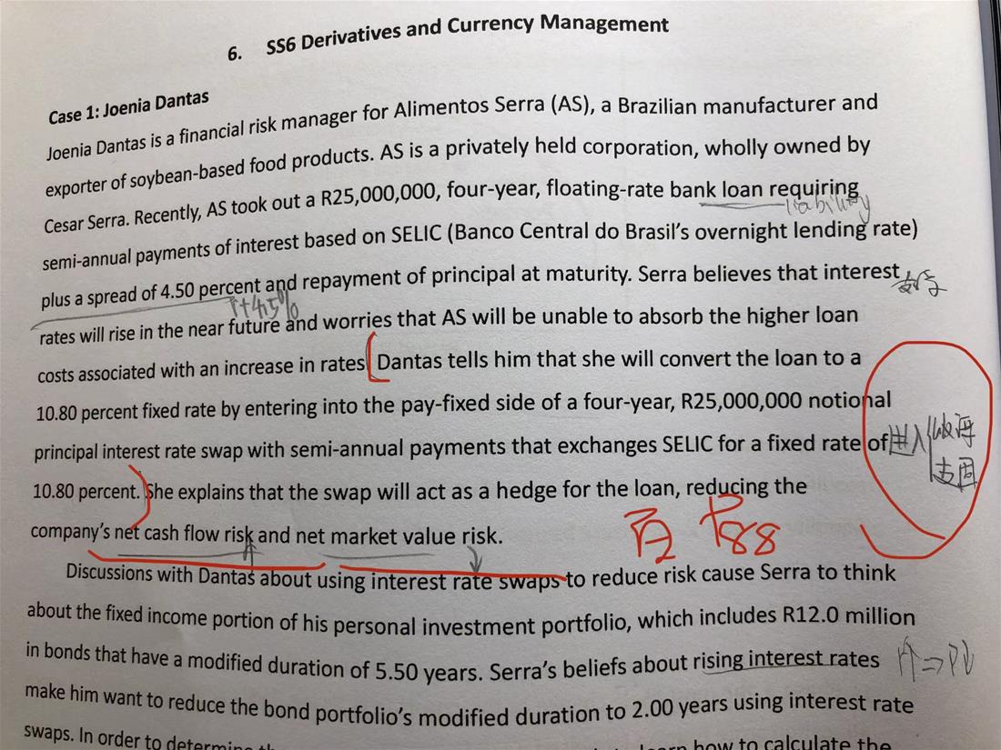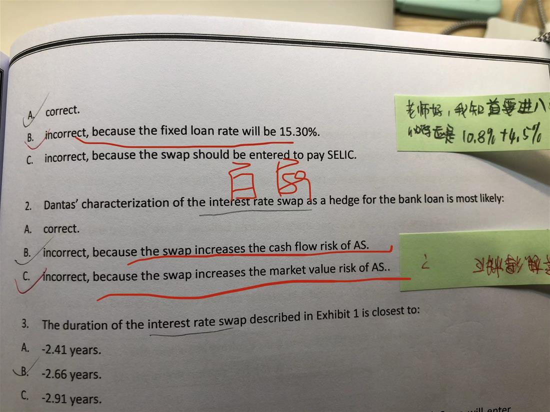 老师您好,这个第一题和第二题我一起问一下。 AS有个支浮动的贷款, 那应该进入一个收浮动支固定的swap, 那么swap的durantion= 浮动的duration-固定的duration. 那不是cash flow risk 增加, price risk 降低吗?怎么我的理解跟答案的是相反的呢?还有第一题我想问一下swap里面收的浮动利率是10.8%+4.5%, 我想问一下swap收的固定利率是多少呢? 为什么答案说的fixed rate也是10.8%+4.5%呢?谢谢