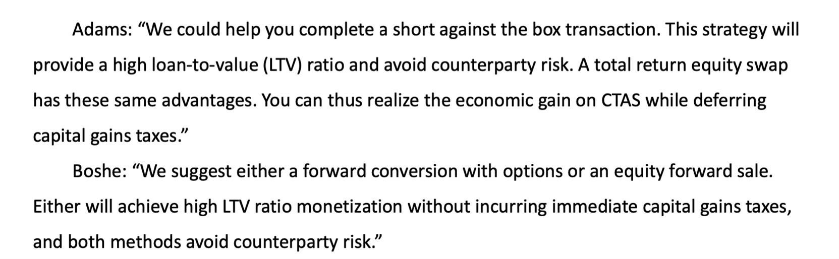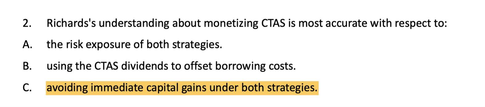 case3 Q2 我觉得选项C不对。cashless collar里short call会有capital gain tax on premium的,此外,short sell+持有股票属于market neutral,而cashless collar由于是股票中心策略,还保留着exposure,或者说beta to stock,这种说法是否正确?