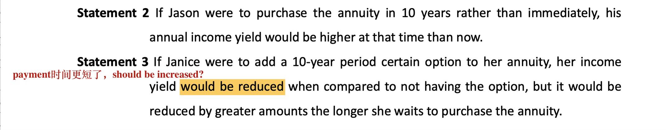 case1 Q5 为什么statement3是对的?当她延迟purchase the annuity,意味着她年龄更高、享受到payment时间更短,对于同样金额的annuity应该income yield会更高呀?