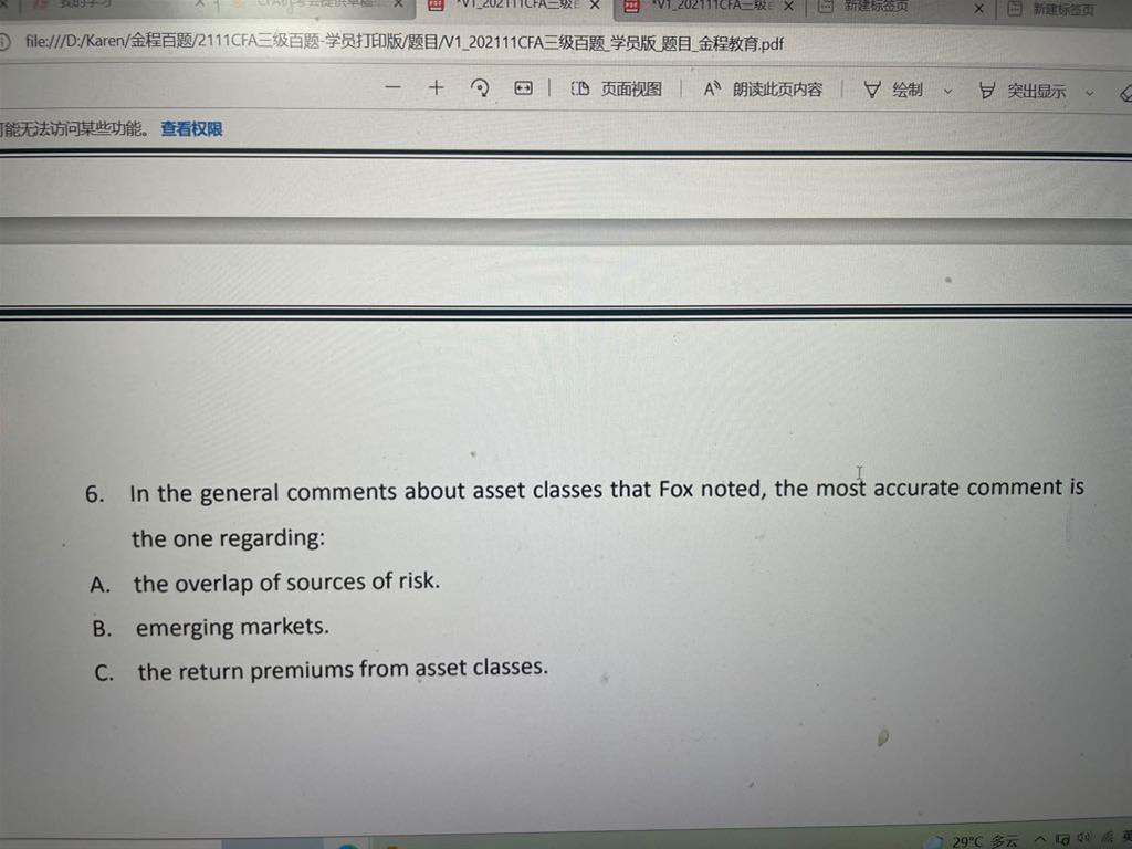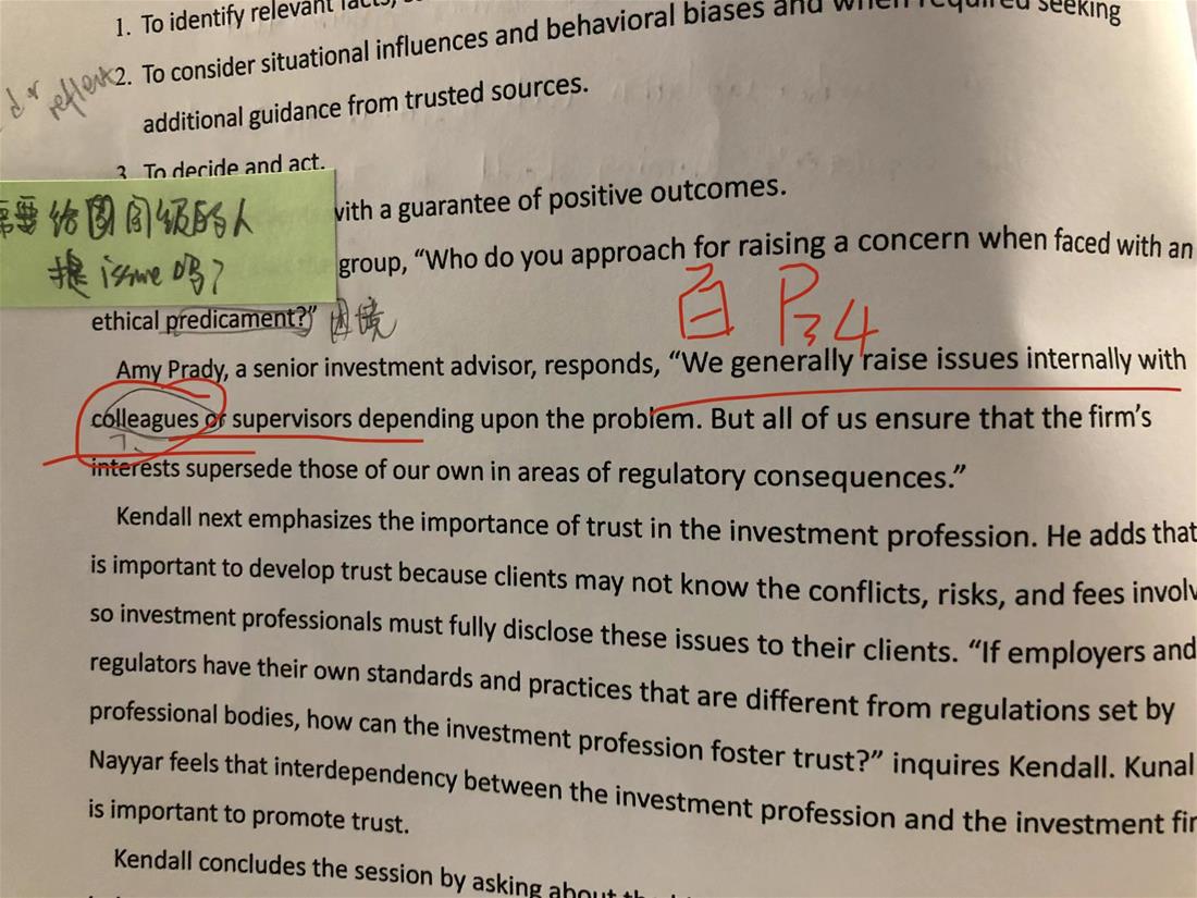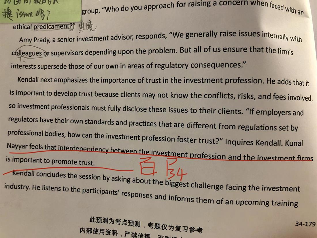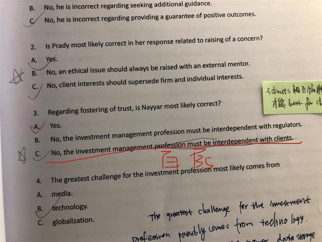已回答老师您好, 这里我有个小问题, 我本来单看文中这句话没有什么问题, 主要是我做题的时候看到选项, 我觉得c更好。 对于the investment profession is interdependent with the investment firms 还不如 interdependent with clients, 与client相互依赖才能更好地为clients服务,如果与firm相互依赖, 不就是把 firm看得比clients更重了吗?所以我觉得interdependence between the investment profession and the investment clients is better to promote trust. 谢谢