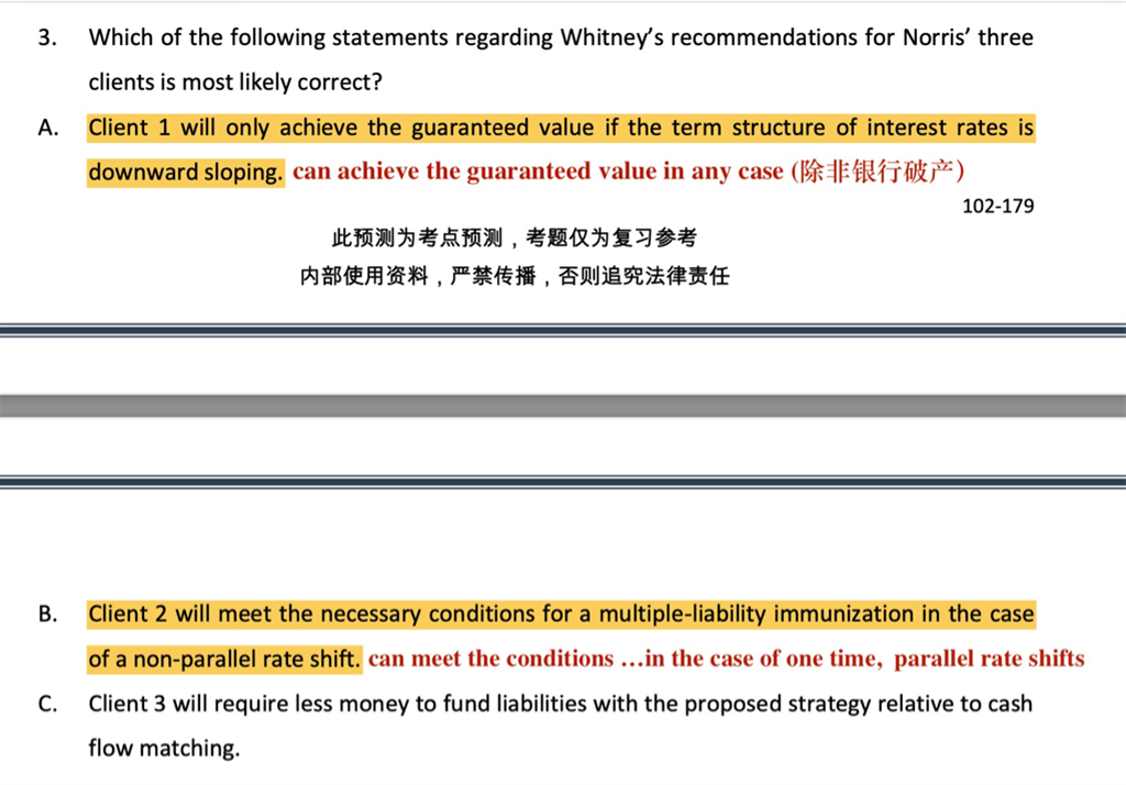 百题 Fixed income第一个case Q3,想问下不正确的那两个选项是不是可以修正如图:第一个是guaranteed return不论什么情况都会被achieved。第二个只有一次性的parallel才可被immunization,另外client2还有一个错误是asset payment应该要比liability更dispersed。