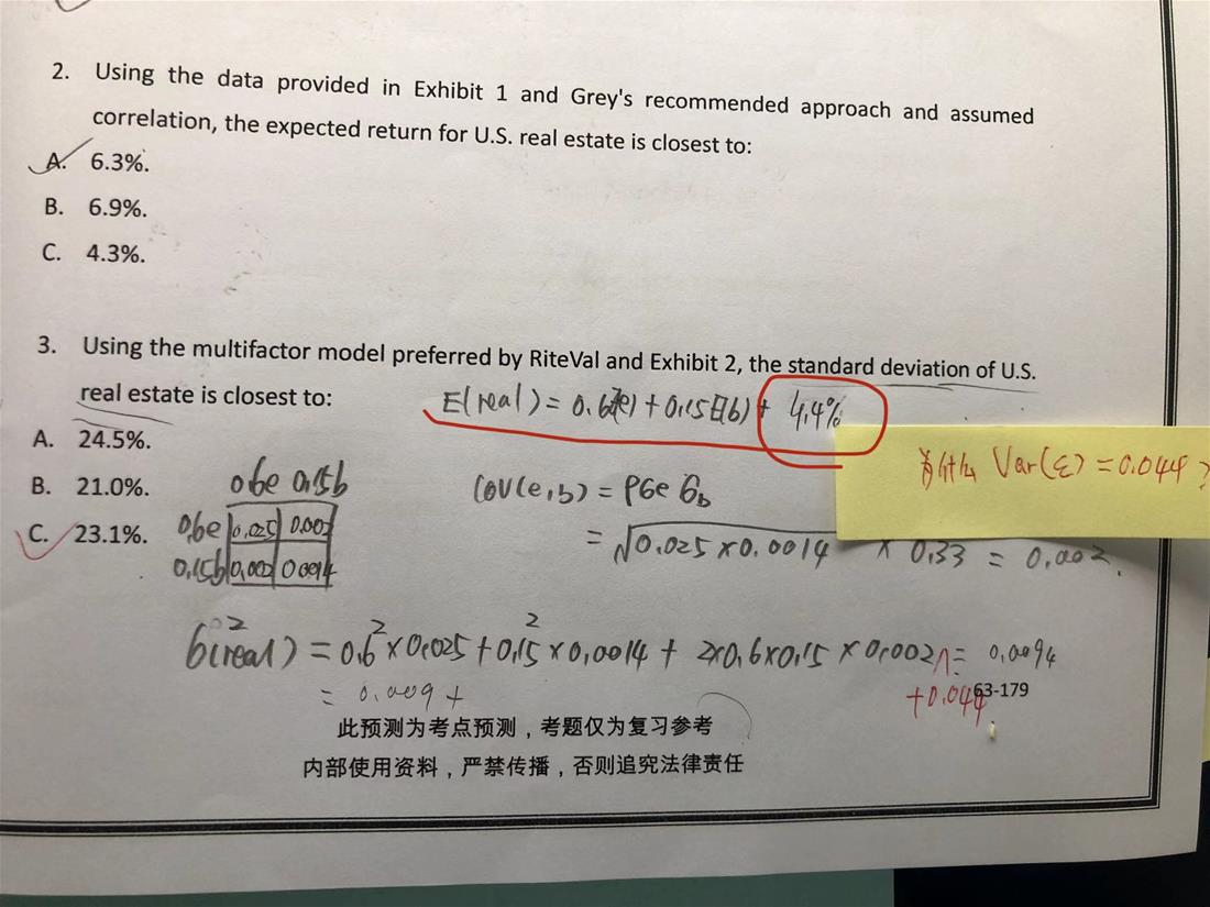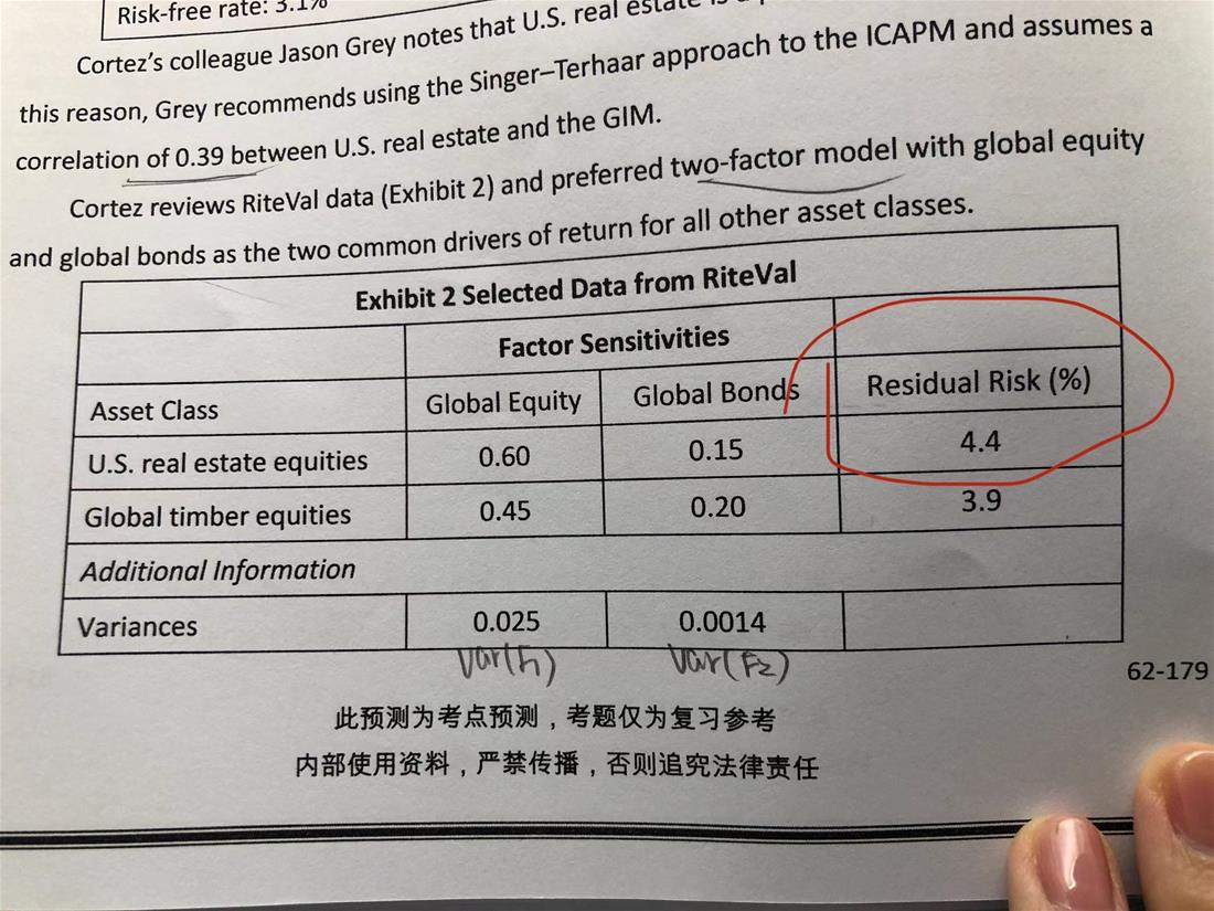 老师您好, 我想问一下这道题为什么variance of error 是4.4%呢? 从题中的表格我认为ER(U.S. real estate equities)=0.6 E(global equity)+0.15 E(global bonds)+4.4%. error 给expected return的贡献是4.4%, 为什么答案中写的variance of errors is 4.4%呢?谢谢