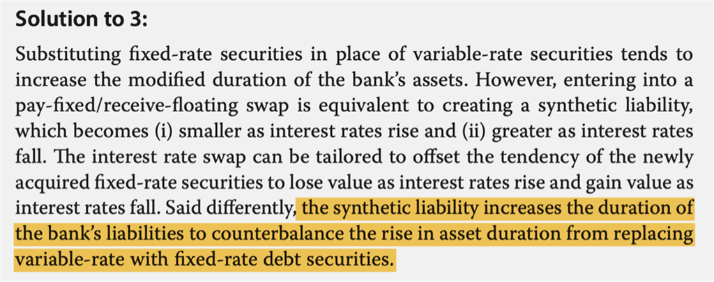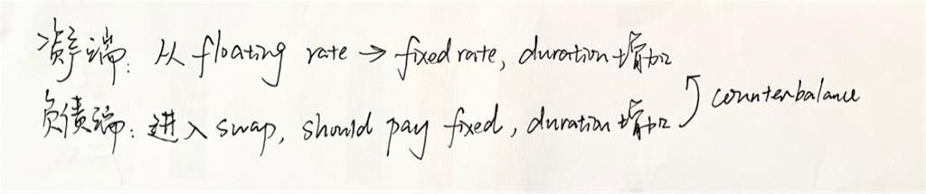 P105 Mini case C 第三问的答案标黄这句话我没看太懂,是不是我图上画的那个意思?进入了 swap,要支付fixed rate,所以liability duration也相应的增长了,正好和asset匹配?