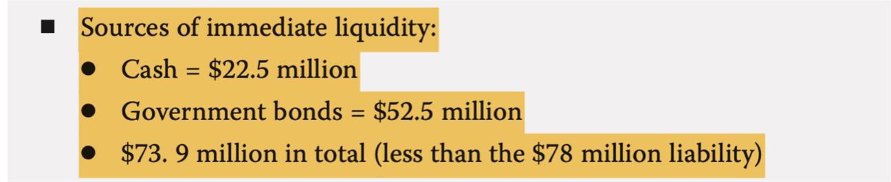 P168 Example9。这里的immediate liquidity为什么加上government bond?我加上的是public equity。因为equity比较容易变现,目前也在range中间,可以继续减持到接近30%的下限,而且equity目前高估值,可以卖掉了,为什么不把它计入immediate liquidity?而government bond怎么判断它是长期还是短期的呢?如果是10—year Treasury bond,就不算是immediate liquidity吧,但这里也没有说一定是T—bill,所以这里bond属于无法判断是不是immediate,我就没有计入。
