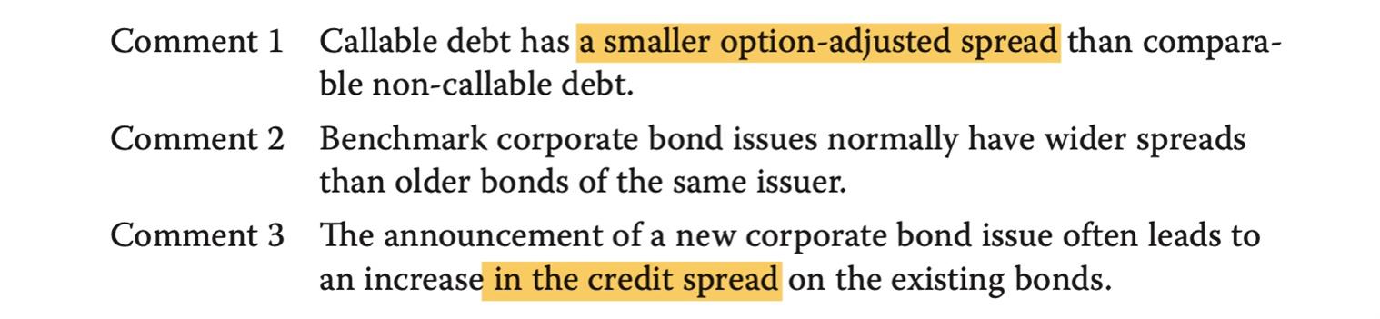 P313 practice problem Q12 为什么comment1不对?调整了call option之后的spread不应该更小吗?putable option的OAS应该更大…另外comment3我觉得不太对,因为credit spread对应机构和产品本身的credit rating,都是短期比较稳定的。新发产品主要是会对老产品的liquidity risk发生影响,所以我觉得这里credit应该改成liquidity更好。