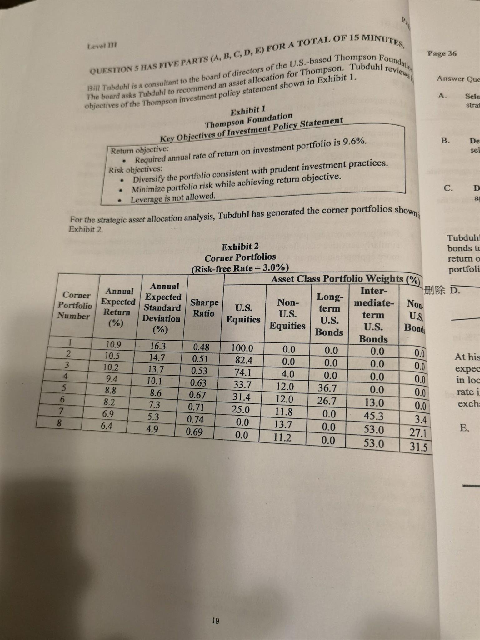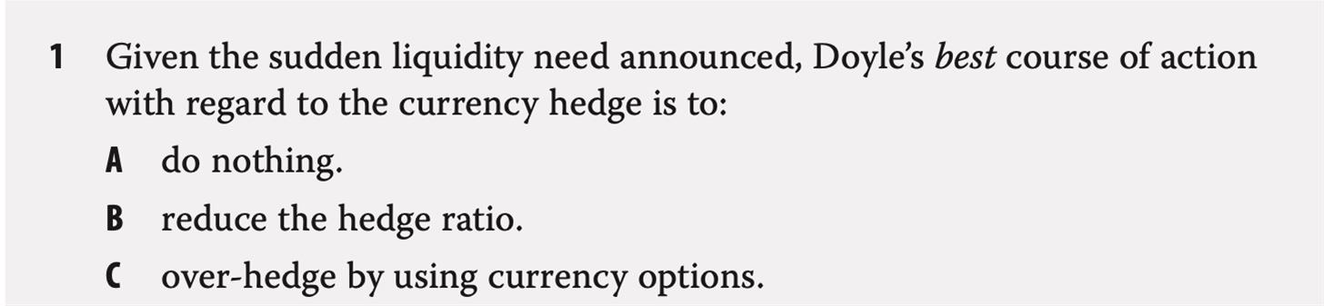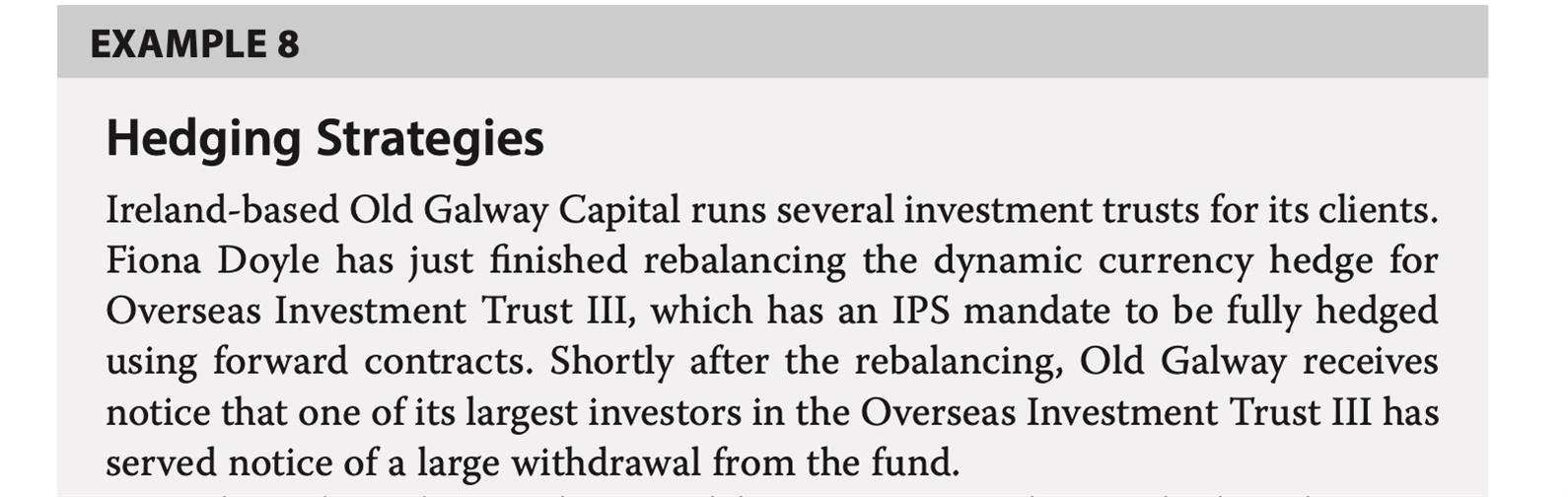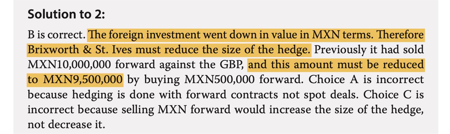 P415 Example5 Q1 有一个大投资者要撤资,那么整体的currency-risk exposure就会减少,这时候应该相应地减少hedging的头寸,为什么可以do nothing?做这题的时候是联想起P399 Example5的Q2(见图三),因为asset size减少了,也应该相应减少hedging的size(但不是hedging ratio)。不知道两题有什么不同?这道题的ABC选项感觉都不对…
