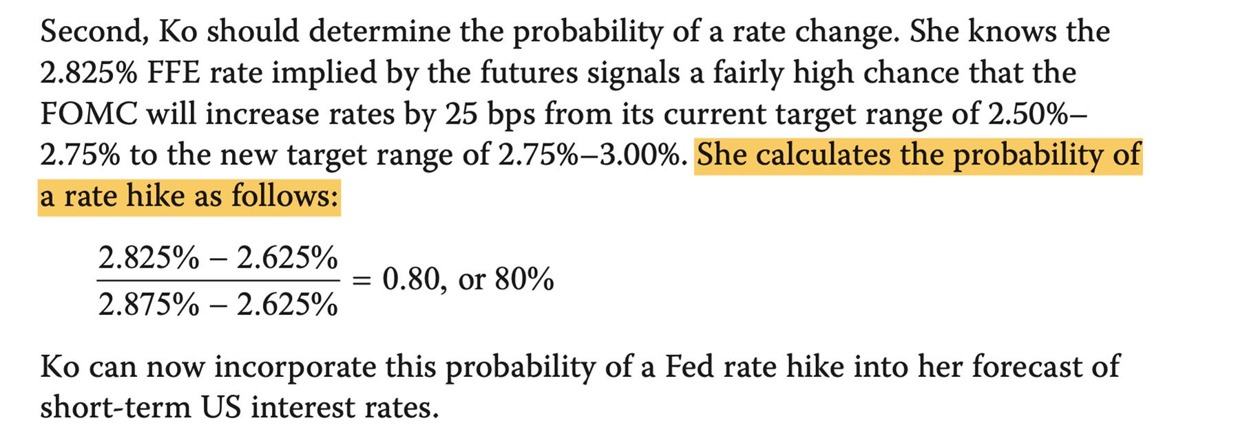 P351 Q10 想问个延伸的问题,这里的current interest rate是2.825%,加息概率是80%。如果是2.9%的话,应该是落到3%—3.25%的区间里,中值为3.125%。则加息概率是(2.9%-2.625%)/(3.125%-2.625%)=55%。为什么如果当前利率更高了,加息概率反而更小了?