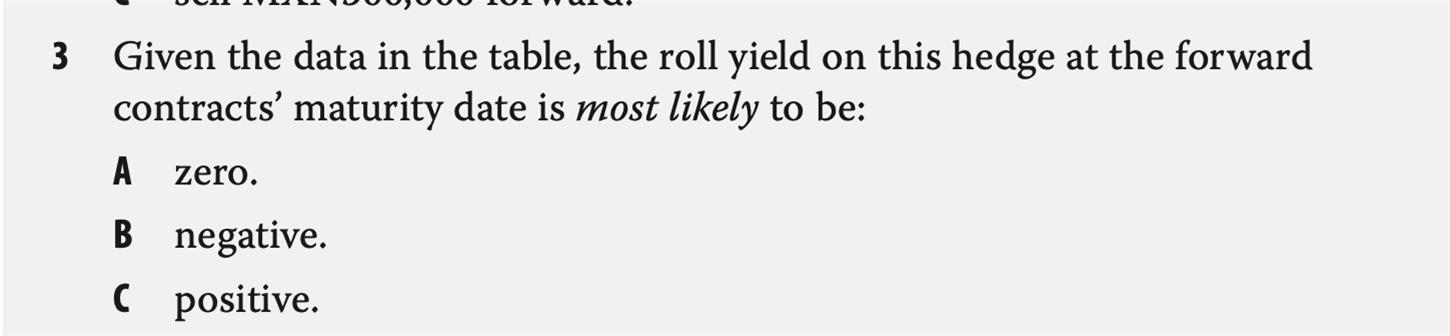 已回答P400 Example5 Q3 首先是想问下是不是因为这里forward point都大于0,所以S-F小于0,roll yield小于0?其次想请老师具体介绍一下roll的操作,最开始是买了MXN/GBP的forward,到期以合约价(这里是1/20.148吧?也就是S)卖出MXN。下一步是再买一个MXN/GBP2个月合约吗,但是题目没有给出该合约的定价(F),所以是无法计算的吧?只能从题目给的forward points趋势来判定?