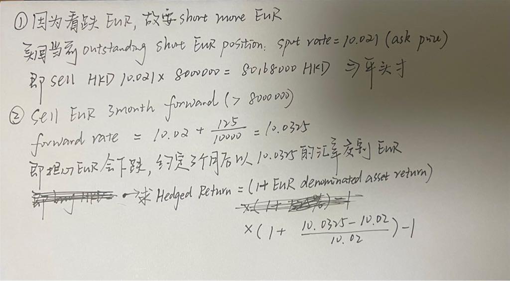 P393 Executing a hedge这个案例的hedge2我没看懂,把思路梳理了一下,请老师看下对不对,以及对hedged return的计算对不对。还有,题目说认为3月后spot rate会下降,但是forward point>0,说明这个有套利空间?也就是HKD/EUR forward被高估了,需要被卖出。三个月后的spot被低估了,可以买入。是吗?这个和要不要hedge是一样的吗?(因为forward rate大于expected spot,所以要hedge,即通过sell forward来hedge)