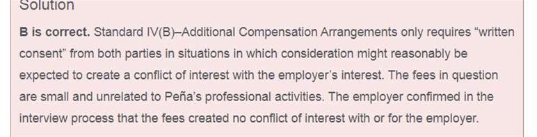 老师好,额外的报酬 说的是 :除非得到 各方的书面同意,否则不得接收与雇主利益相争或者可能被 合理预期有 利益冲突,这里面有两点,一是与 本职工作存在竞争,二是合理预期有利益冲突,图中这道题是 二者都遇到了 ,我想问一下,如果报酬是 与本职工作相关的,但是 金额很小,题中有not material这句话,被预期无利益冲突,是否需要书面同意?