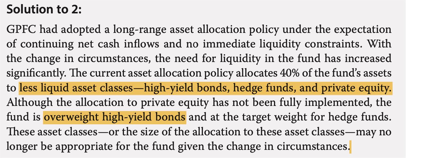 P208 Example6 Q2 因为现在portfolio需要更多流动性,所以不应该投资high-yield bond等资产。—————想知道为什么high yield bond不能多投?它是类似股票的,current portfolio也增加了股票仓位但是答案没说股票这样不行,为什么垃圾债这样就不行?另外,如果是要提高流动性的话,在当前的资产类型里选择,是不是还可以增加domestic intermediate bond的比重?(按照答案的意思也就是说,要增加equity和intermediate bond的比重,减少另外三个的比重?)