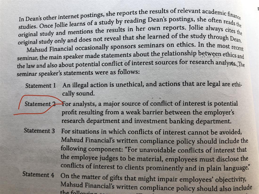 老师您好,我想问一下这个statement 2 有点点奇怪,因为我认为研究部门和投行部门的barrier主要是为了防止MNI,怎么a weak barrier 是primary source of conflicts of interest 呢?conflicts of interest是公司本身的结构或者员工影响,跟你设不设barrier没什么关系啊。 谢谢