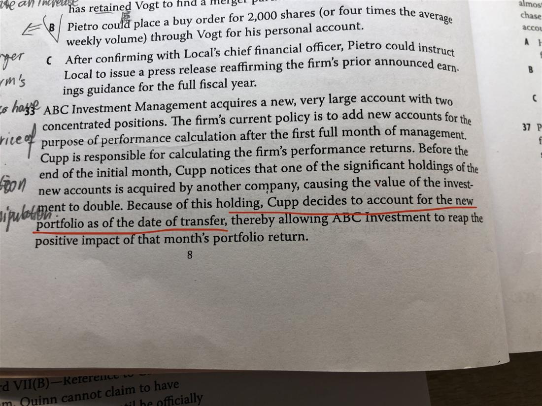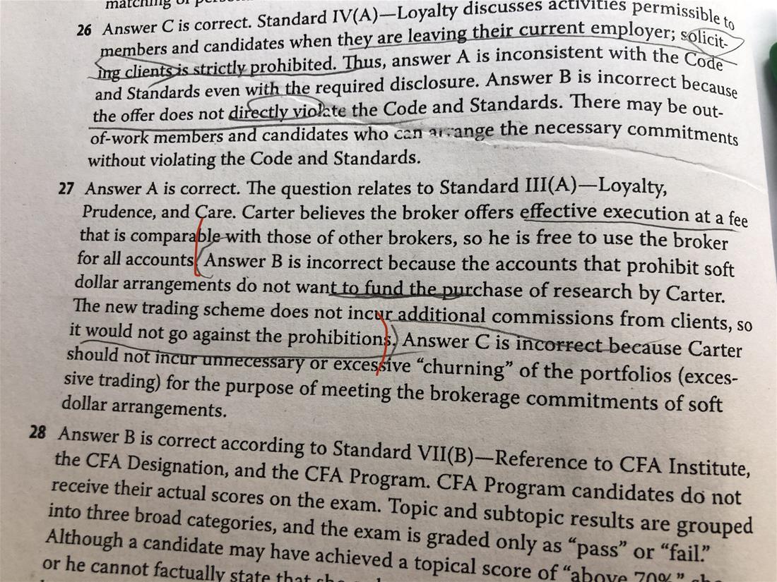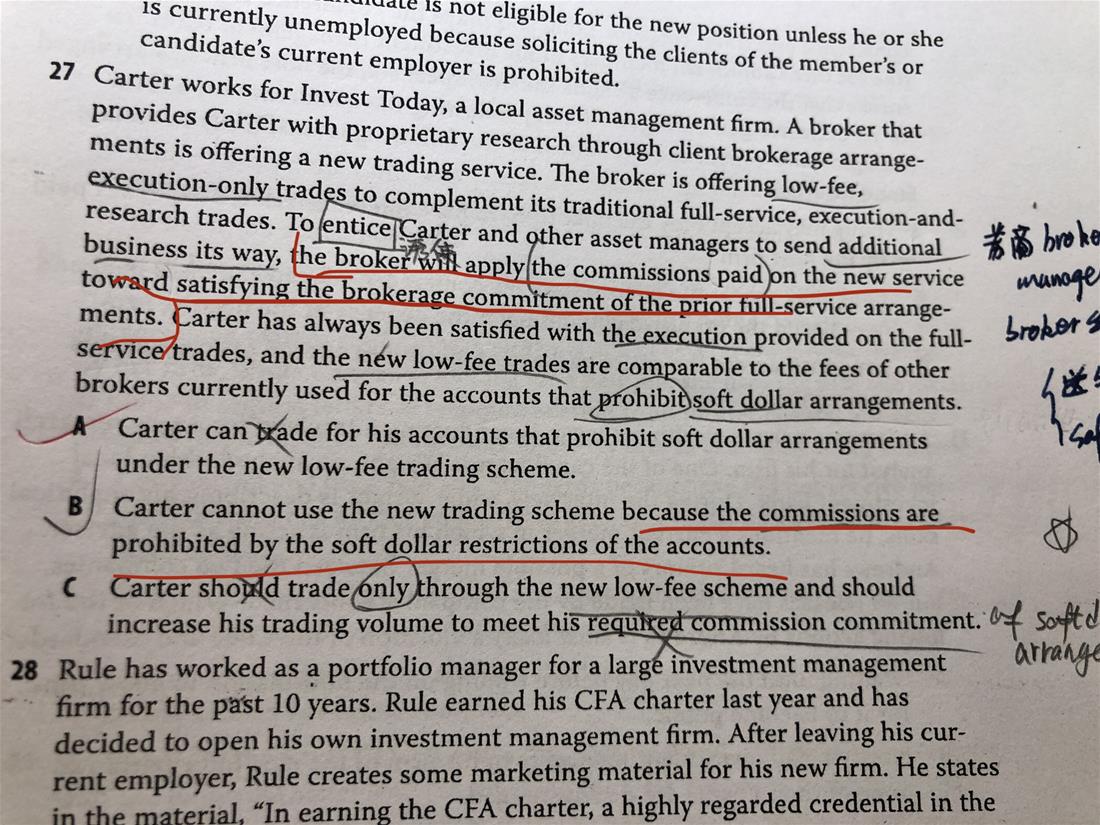 老师您好, 这道题我划线的部分(the broker will apply the commission paid on the new service toward satisfying the brokerage commitment of the prior full-service arrangements. )怎么理解呢?还有就是选项B commissions are prohibited by the soft dollar restrictions of ht accounts也是奇奇怪怪,不管broker给不给 soft dollar to manager,该收的commission也得收啊, 所以不能理解这句话. 答案上面解释为什么不选B的理由也看不太懂。 麻烦老师讲解一下。谢谢