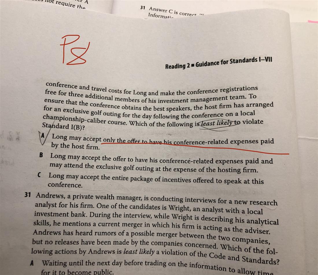 老师您好,我想问一下这里的conference-related expenses 是指文中的conference and travel cost and conference registration吗?本来就不应该收的,所以我本来觉得这三个选项都不太对。 但提问问的是which of the following is least likely to violate standard.所以我才选的A。 least likely to violate standard 其实也不是说这样做就是合规的,对吧?谢谢