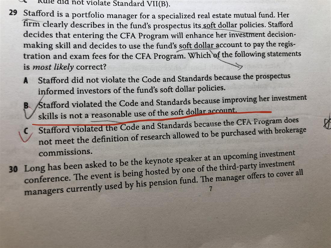 老师您好,请问这里的B选项怎么错了呢?的确improving investment skill is not a reasonable use of the soft dollar account. 因为improve investment skill是间接让clients收益, 不是直接对manager做投资决策收益。 谢谢