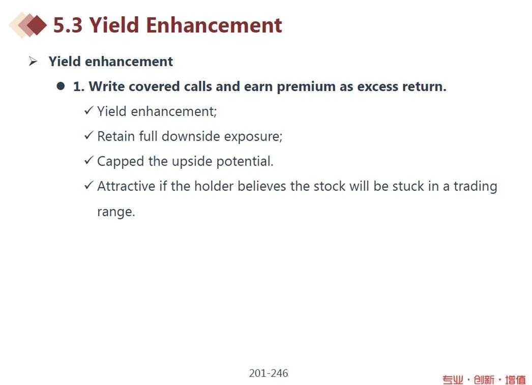 已回答老师在讲这张ppt的时候讲了Yield enhancement的一种方法:比如说你预测某种股票不会大涨也不会大跌,那我可以long stock的同时short calls (吃准了不会涨到别人行权), 赚一笔期权费去enhance yield. 我的问题: 这种long stock的同时short calls 叫做什么方法呀?我看既不是Synthetic long/short forward, 也不是Synthetic call/put啊?还是这种操作就没有一个正式的名字?