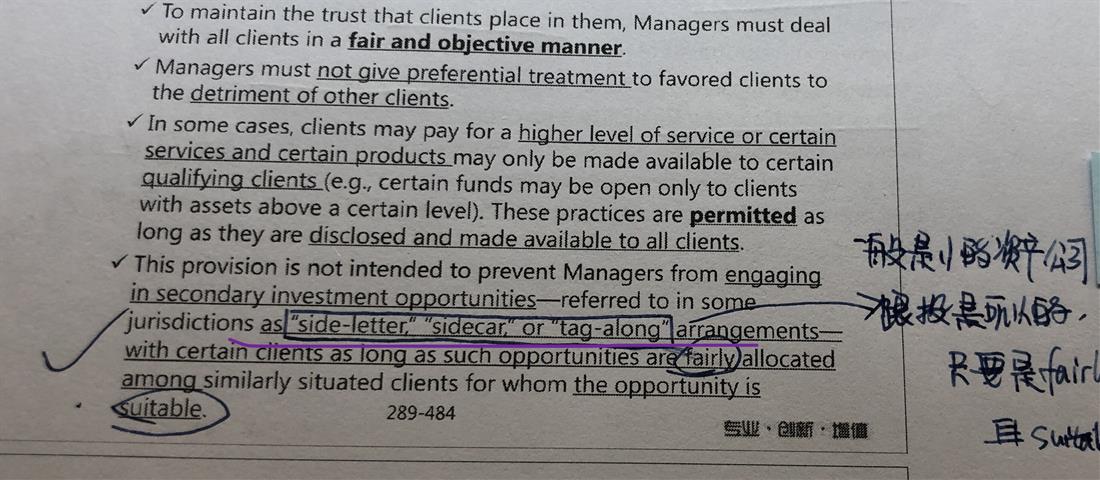 老师您好,这里我点疑问, 老师上课说可以跟投,只要fairly allocate而且suitable就行了, 但是我觉得这里有点像违反了standards里面的diligence, 我知道AMC跟standards不一样,感觉跟投好像没有尽责。 请问为什么跟投是OK的呢?谢谢