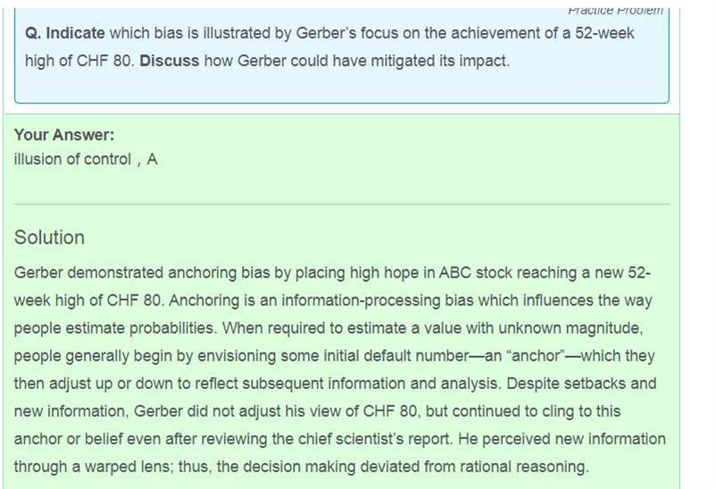 已回答老师好,这道题不懂,几个问题:1、原文 里 就提到一次这个 80高水位,为什么答案说是锚定效应 ?2、抛开这道题,对于锚定效应,是不是 说题中凭空有个具体 的股价目标或数值,而且这个数值并没有说是来自于基本面分析、价值分析等 字眼,就是表明 存在锚定效应偏差?3、我看 冲刺笔记上对于锚定有个high water mark,是不是这是个题眼?只有这个词,加上数,就表明存在锚定,还是说像第 2个问题那样只要有数就存在锚定效应?