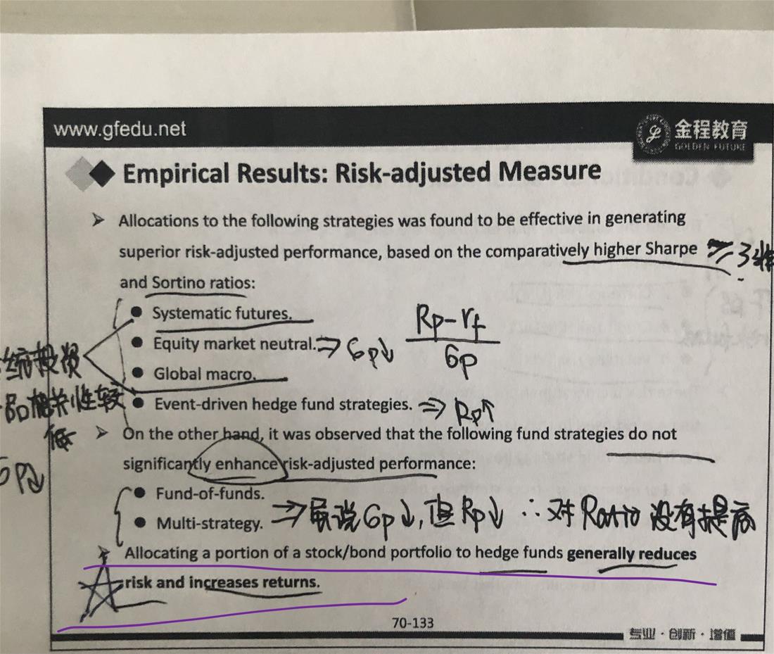 已回答老师您好,划紫色线的这句话怎么理解呢?hedge fund加进portfolio 感觉只会decrease risk, 按理risk降低, return还应该会减少,为什么这句话写的是reduce risk却increase return了呢?谢谢