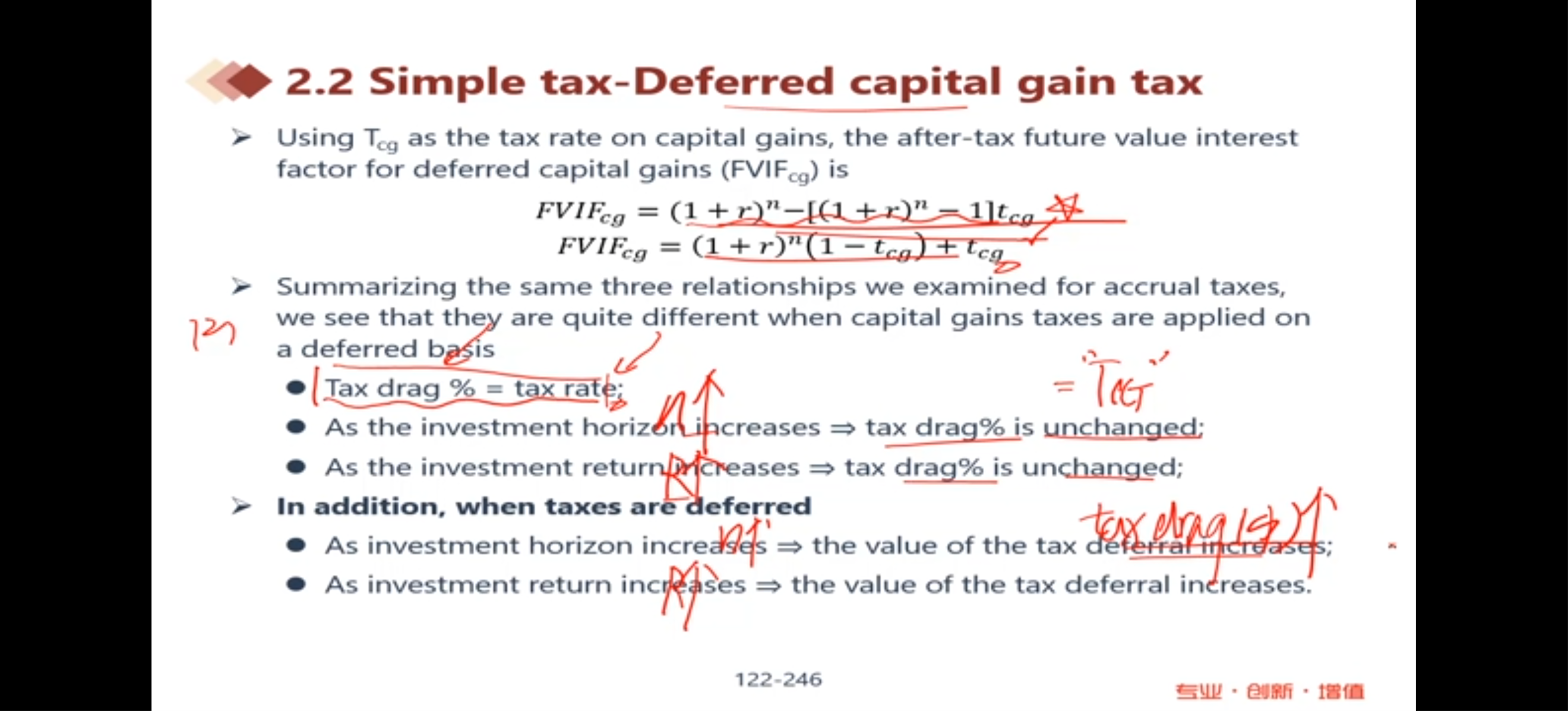算tax的时候分子分母都是(1+r)^n,也就是n年的,那算出来的tax drag是不是 也应该是n年的,为什么可以直接和tax rate比。为什么第一个on occurred return,.drag大于rate,第二个on capital就是等于?而且rate等于,dollar金额大于?
