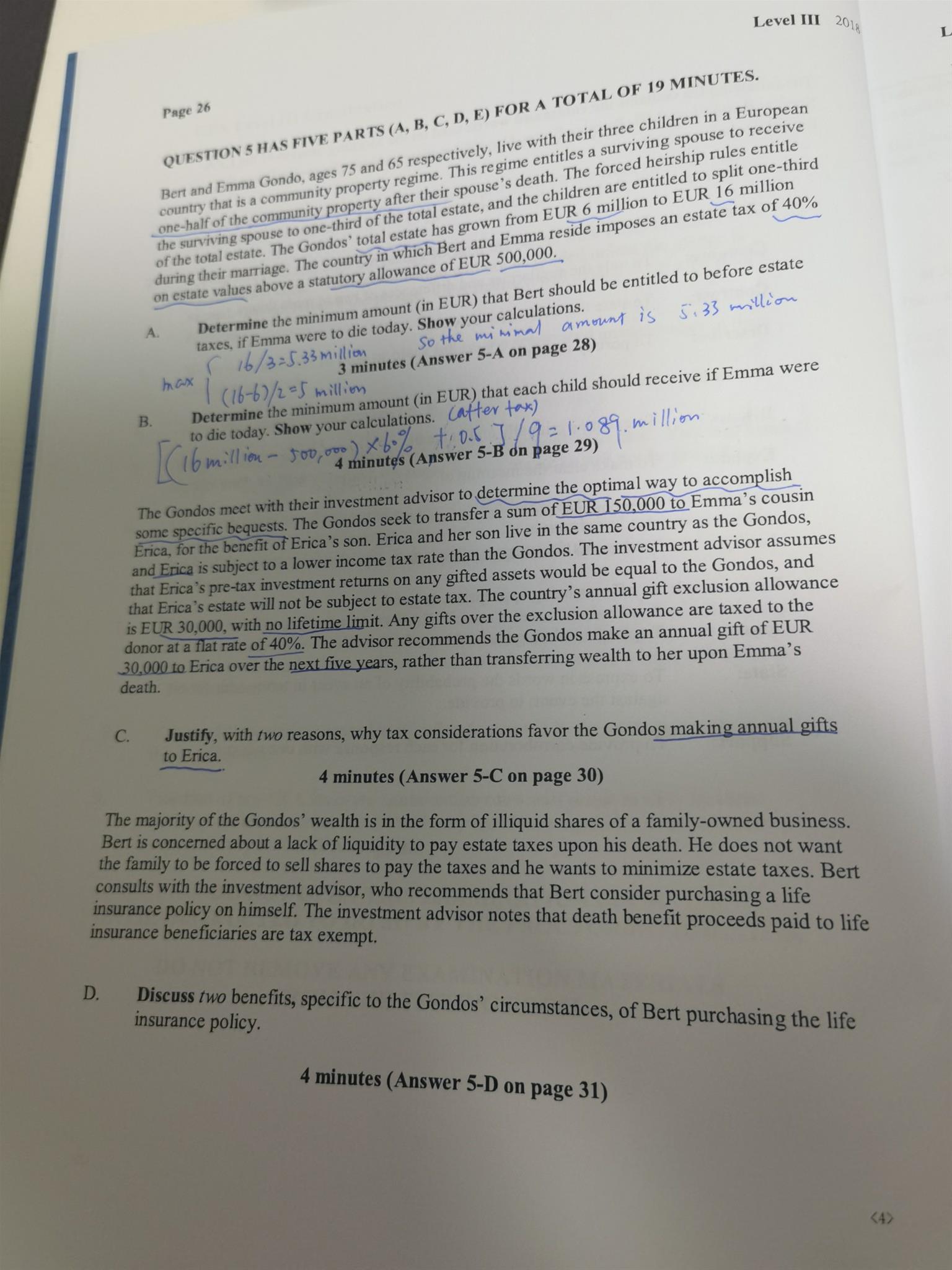 D 1) since the investment only on gondos' family-owned business may bring concentrated risk to Bert, it is better for Bert to diversify its investment on different assets. life insurance could give the diversification to his investment. 老师能否帮我看看我写的第一条理由可以吗,除了答案中表示的流动性和免税,是否还能些投资风险分散的好处?