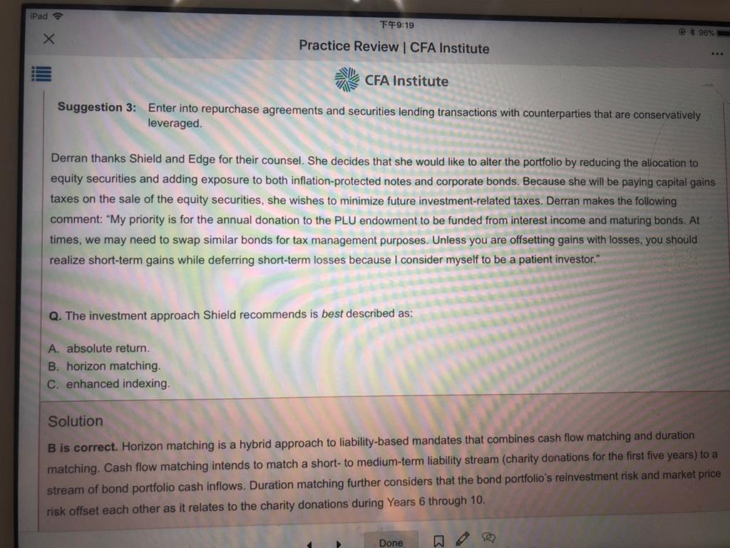 这个提问怎么没了?我重发。这题的原文是否有问题,如果是horizon matching 应当是immunization跟cash flow matching结合,可是原文是combines immunization with duration matching ,这俩不是一回事吗?
