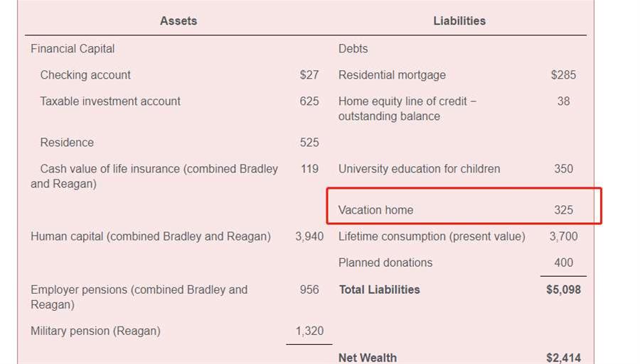 老师好, 这道题让算 :Using the data in Exhibit 1, the Grahams’ net wealth (in thousands) is closest to?不明白为什么答案要算上将来 买房子,而且还算在 liability里 ,我的理解是将来花325W买,那么不是对应的 钱少了但是 资产多了么 ,对wealth