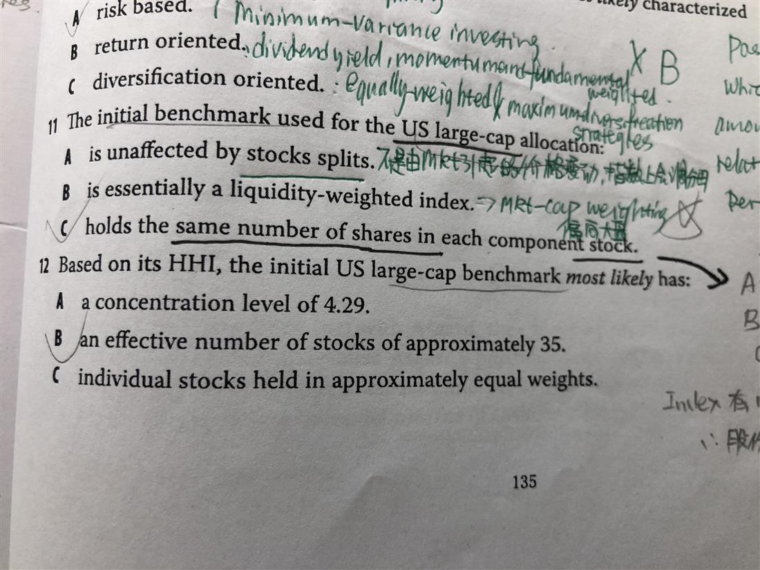 已解决老师您好, 这是equity下午题P135 的11题 ,我想问一下A怎么错了呢?stock split不是由于market引起的价格变动,不应该反映在指数上, 所以指数的分母会相应做调整, 所以A应该是对的啊, pricing weighted index is unaffected by stocks splits.谢谢