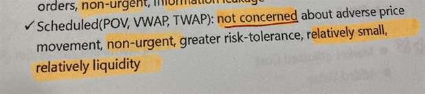 第一张照片:为什么这个scheduled是not concerned aboutadverse price movement呢?有两种理解方向,1 因为我可以有一整天的时间慢慢交易,所以我不担心价格反向波动。 2 因为我太看重价格反向波动对我的影响,我又不着急,所以我就选择在时间上宽裕一点,慢慢交易。第二种理解方式得出的结论完全不同,我到底应该从哪方面去理解呢?以及为什么另外一种方式理解就不对呢? 第二张照片:为什么arrival pruce是担心adverse prices movement呢?交易的那么激进那么紧急,必然会导致很大的价格反向变动啊。他明显就是不看重价格反向变动才会交易的如此激进,因为订单urgent呀
