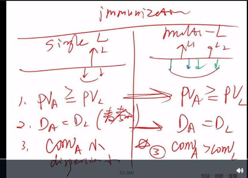 13.51左右,1 请问为什么immunization对于single liability和multi liability第三条要求不同,2 基础班我是听的cherrie老师讲的,她讲这个免疫策略条件时并未区分single还是multiple liability,只是说为了减小yield curve risk最好convexity要尽量小,但是又希望里路产生平行移动时,资产比负债涨的更多跌的更少,综合来讲她的免疫条件第三条就是convexityA>L,且convexityA尽量小。我想问一下是否有必要去区分single和multiple的liability条件?以及如果有必要区分,为什么两者的第三个条件不同,是因为什么需求导致的不同?