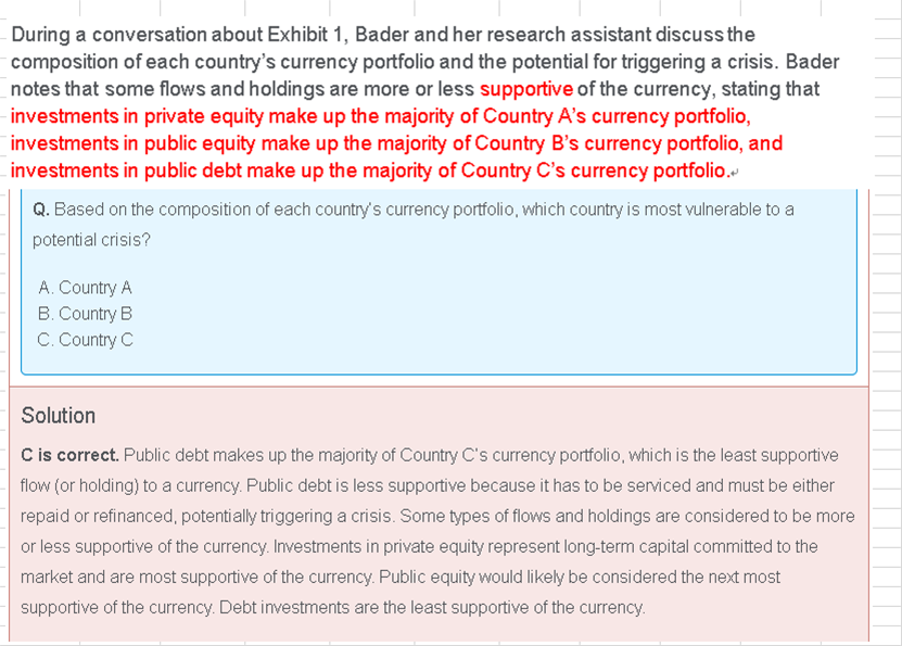 老师好。官网题。读不明白这段话的意思,也不明白它说的内容。其中investments in private equity make up the majority of Country A’s currency portfolio, 一个国家的货币组合主要投资在私人股本,这是什么意思??顺便解析一下其中的原理,谢谢!