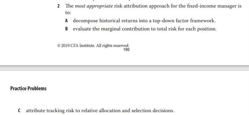 第35章课后题第2题。本题正确答案为C,但我选择了A。正确答案解说中称,文中基金经理选择的风险归因方式是相对式(relative)。然而我认为其选择的风险归因方式是绝对式(absolute)。原因是文中提到,该基金经理十分重视宏观经济因素对信贷市场的影响。而宏观经济因素不是相对性指标,而是绝对性指标。请问,本题应该如何理解正确答案?谢谢!